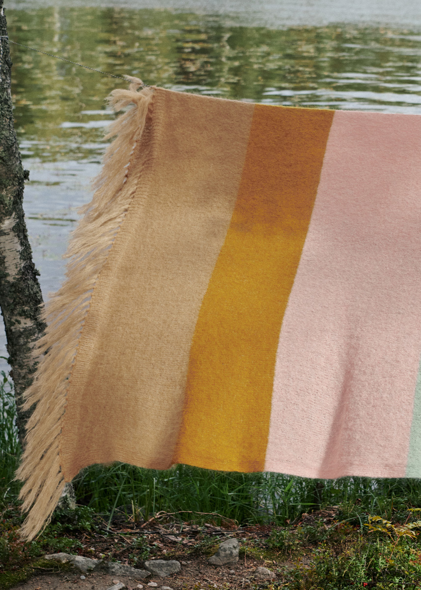Lana Grossa-kvalitet „Brigitte No. 3“ (40 % mohair superkid, 37 % ren ny ull, 23 % polyamid, löplängd = ca 100 m/25 g): 175 g puderrosa (färg 26), 50 g vitgrön (färg 42), 100 g mjuk rosa (färg 8), 75 g curry (färg 22), 175 g kamel (färg 19); lång rundsticka nr. 4; virknål nr. 4,5.