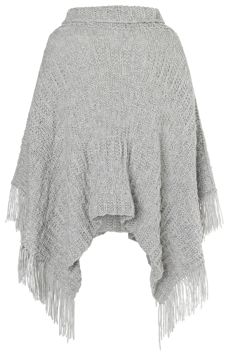 Lana Grossa-kvalitet „Alta Moda Cashmere 16” (78 % ren ny ull (merino), 12 % Kaschmir, 10 % polyamid, löplängd = ca. 110 m/50 g): ca. 600 (650) g ljus grå melerad (färg 1); rundstickor nr. 9, 50 och 100 cm lång, 1 ullnål [synål] nr. 6till fransarna.