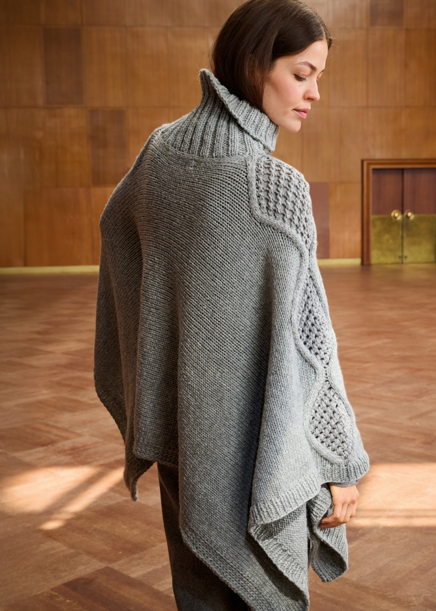 Lana Grossa Cool Merino Big (90% ren ny ull (merino ), 10% polyamid, løpelengde 90 m/50 g), 850 (950) g lysgrå (farge 218) og Glamour (55% polyamid, 45% polyester, løpelengde 112 m/25 g), 50 (75) g grålila (farge 2); rundpinner nr. 6 og 7, 100 cm lang, 1 rundpinne nr. 6, 40 cm lang, såvel som 1 flettepinne.