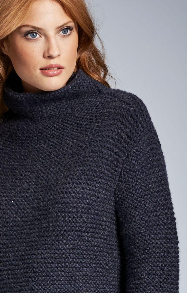Lana Grossa-kvalitet ”Alta Moda Cashmere 16” (78 % ren ny uld 16μ, 12 % cashmere, løbelængde = ca. 110 m / 50 gr.): ca. 550(600-650) gr. natblå (fv 11), strikkepinde nr. 7 og 8, rundpind nr. 8, 50 cm