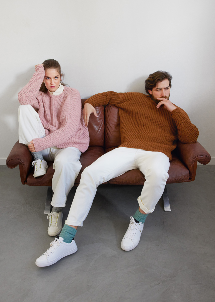 Lana Grossa-kvalitet „Alta Moda Cashmere 16“ (78 % ren ny uld (merino), 12 % cashmere, 10 % polyamid, løbelængde = ca. 110 m / 50 gr.): ca. 600(650-700) gr lys rosa (fv 39) eller brun (fv 42), strikkepinde nr. 6 og 7, rundpind nr. 6, 40 cm.