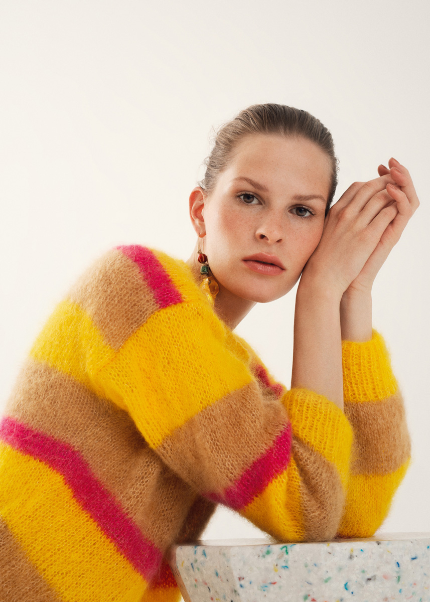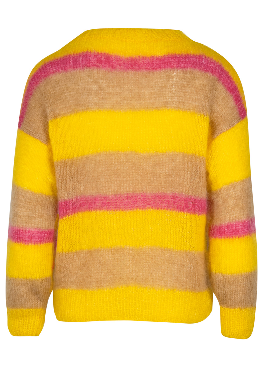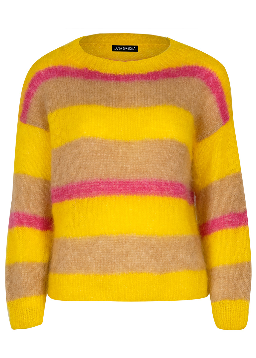 Lana Grossa-kvalitet ”Brigitte No. 3” (40 % mohair, 37 % ren ny uld, 23 % polyamid, løbelængde = ca. 100 m / 25 gr.): ca. 100(125-150) gr gul (fv 1), 75(100-125) gr camel (fv 19) og 25(25-50) gr pink (fv 28), strikkepinde nr. 4 og 5, rundpind nr. 4, 40 cm.