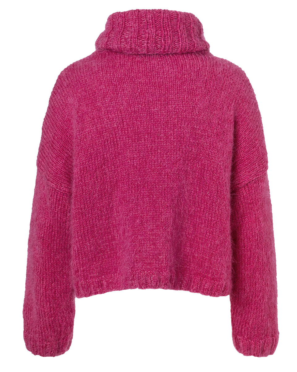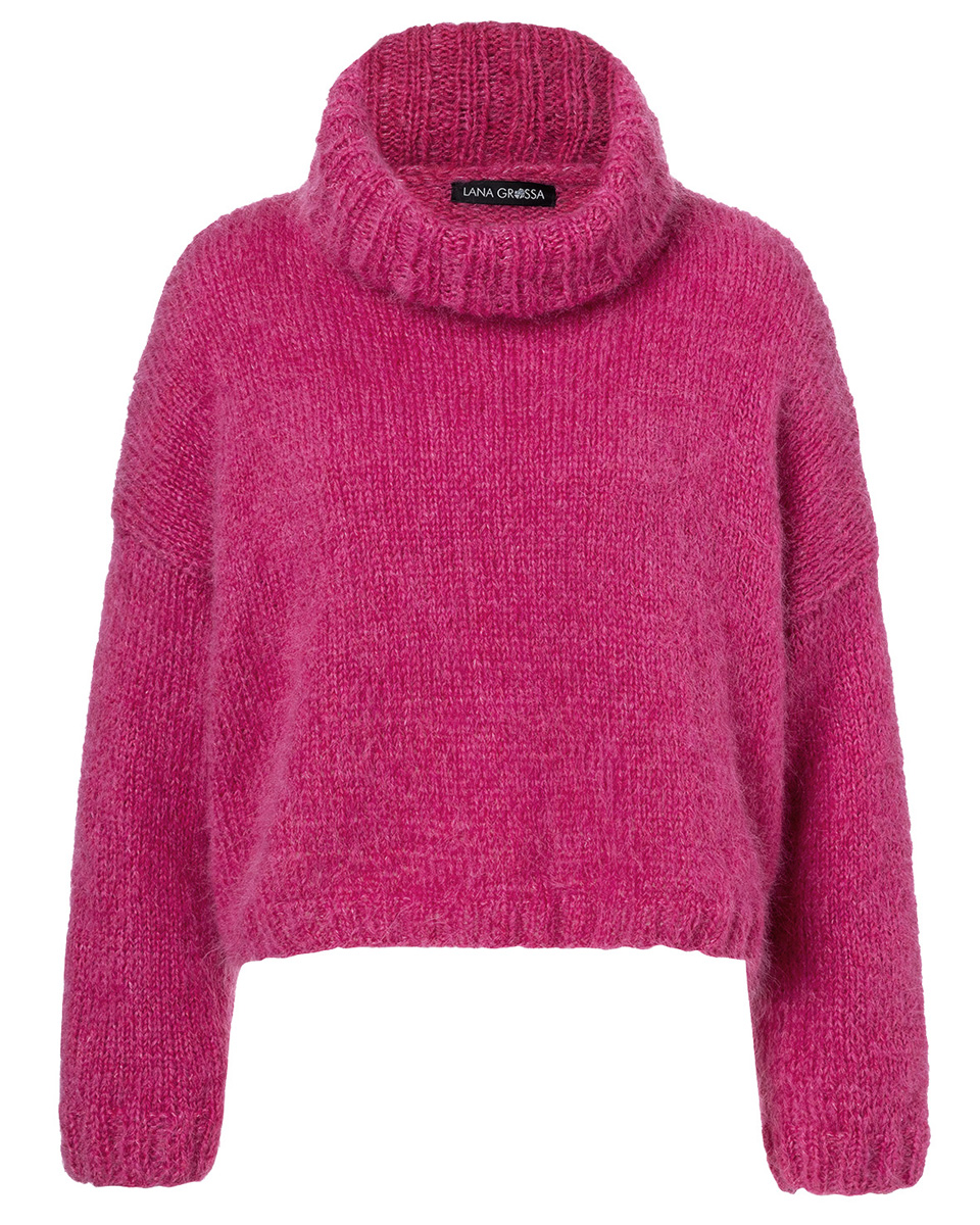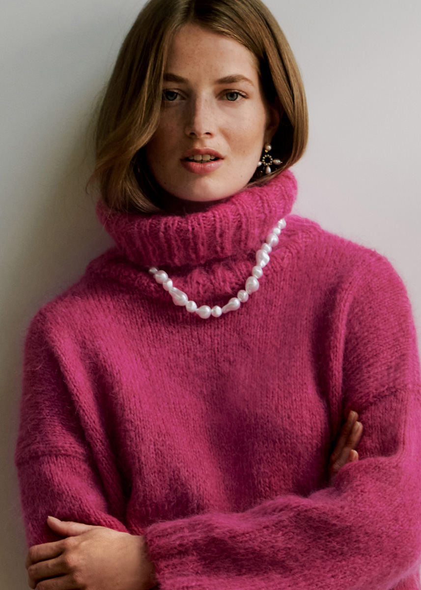 Lana Grossa-kvalitet ”Brigitte No. 3” (40 % mohair, 37 % ren ny uld, 23 % polyamid, løbelængde = ca. 100 m / 25 gr.): ca. 350(375) gr pink (fv 28), strikkepinde nr. 4½ og 5, rundpind nr. 4½ og 5, 50 cm. Bemærk: Modellen strikkes med dobbelt garn.