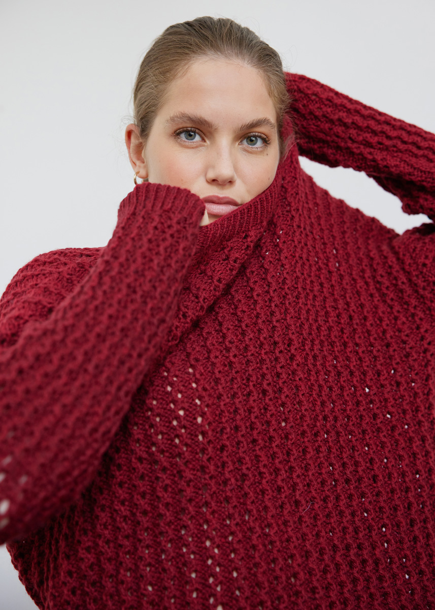 Lana Grossa-kvalitet „Cool Merino“ (90 % ren ny uld (merino),10 % polyamid, løbelængde = ca. 150 m / 50 gr.): ca. 500(550-600) gr mørkerød (fv 1), strikkepinde nr. 4½ og 5½, rundpind nr. 5, 40 cm.