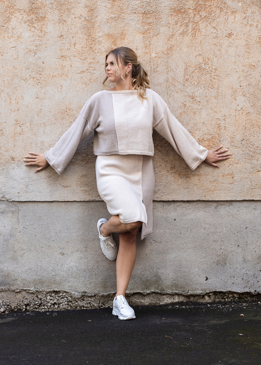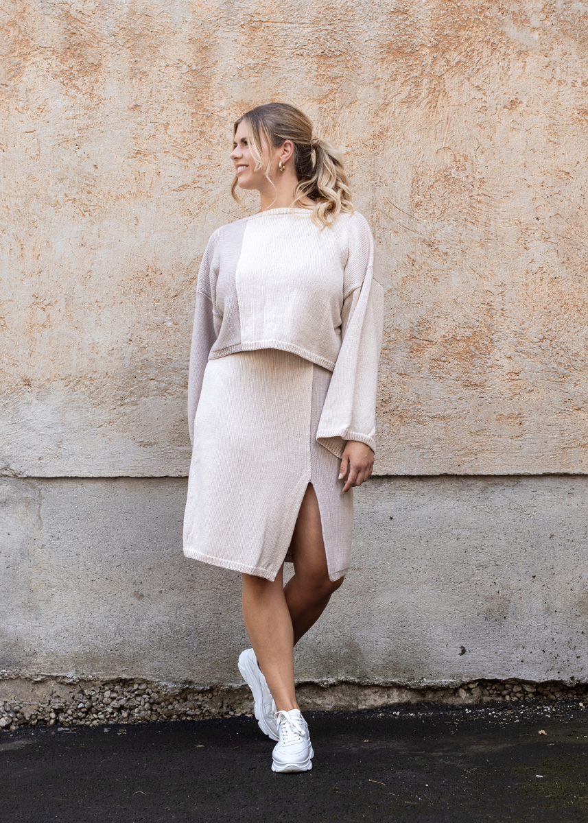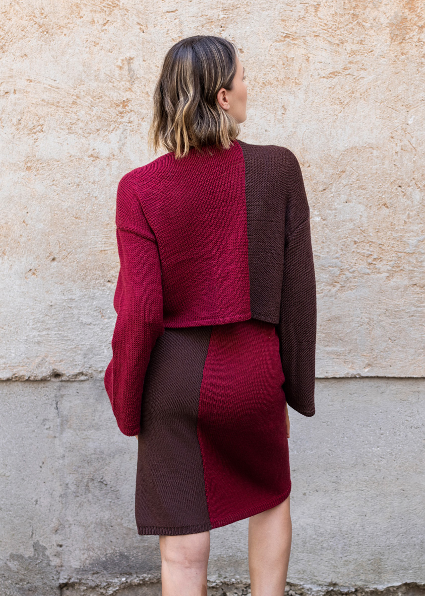 Lana Grossa COOL WOOL 100 % ren ny ull (merino extrafine) Løpelengde: ca. 160 m / 50 g • 200 (200 - 250 - 250 - 300 - 300) g indiskrød (farge 2068) eller natur (farge 590) • 150 (150 - 200 - 200 - 250 - 250) g mokka (farge 2074) eller beige (farge 526)