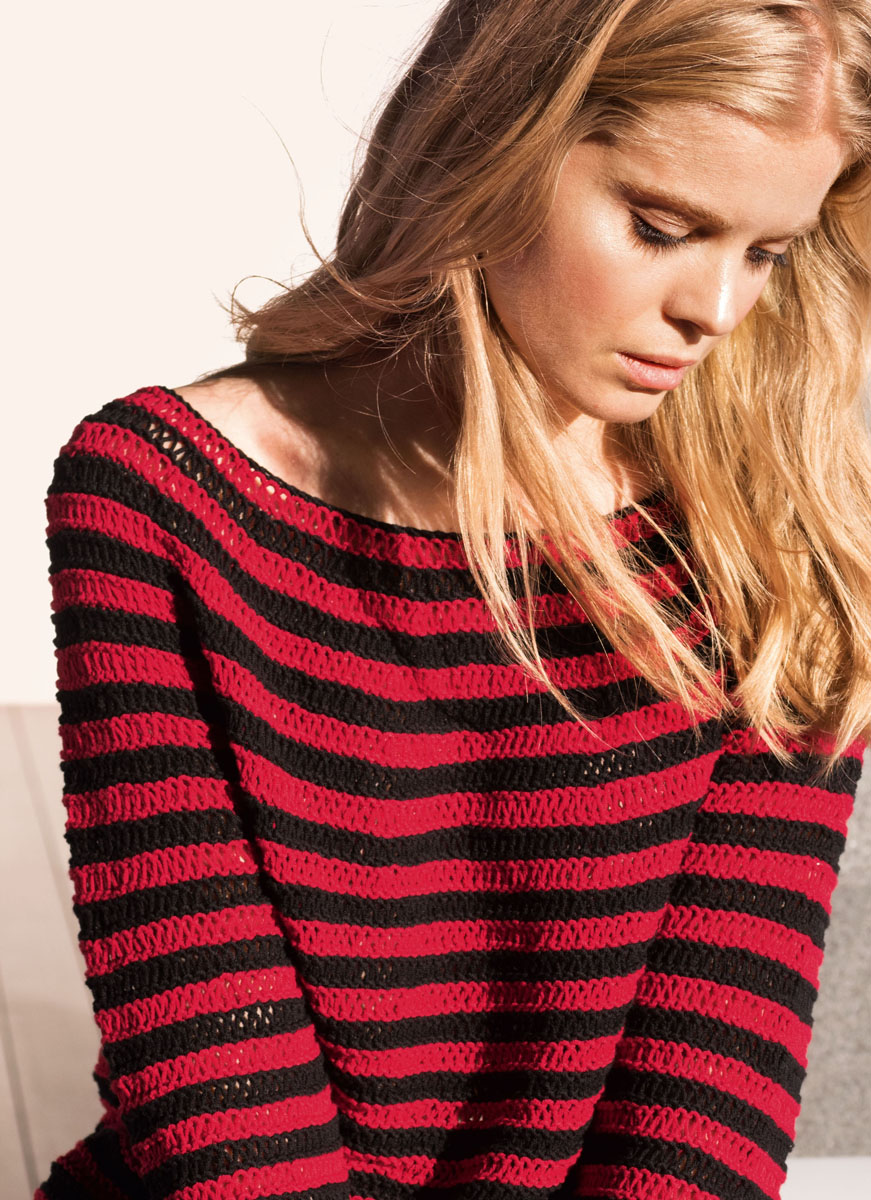 Så er maritimt blevet moderne. I stedet for klassisk rød-hvid eller marine-hvid kombinerer vi to kraftige farver. Den løse struktur i mønsteret og det runde bærestykke giver bonuspoint.