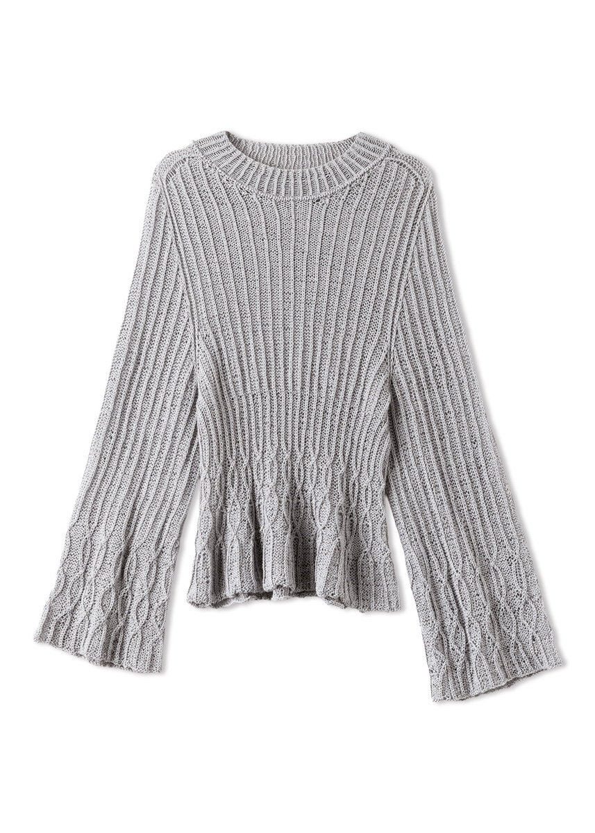 Garn: Lana Grossa «Filo Lurex» (94 % bomull, 6 % polyester, LL = ca. 145 m/50 g): Ca. 400 g lys grå (frg 14). Pinner: Kort og lang rundpinne nr. 3 og 3,5, en flettepinne. Tilbehør: To maskemarkører i to forskjellige farger. Genseren blir strikket ovenfra og ned i ett stykke.