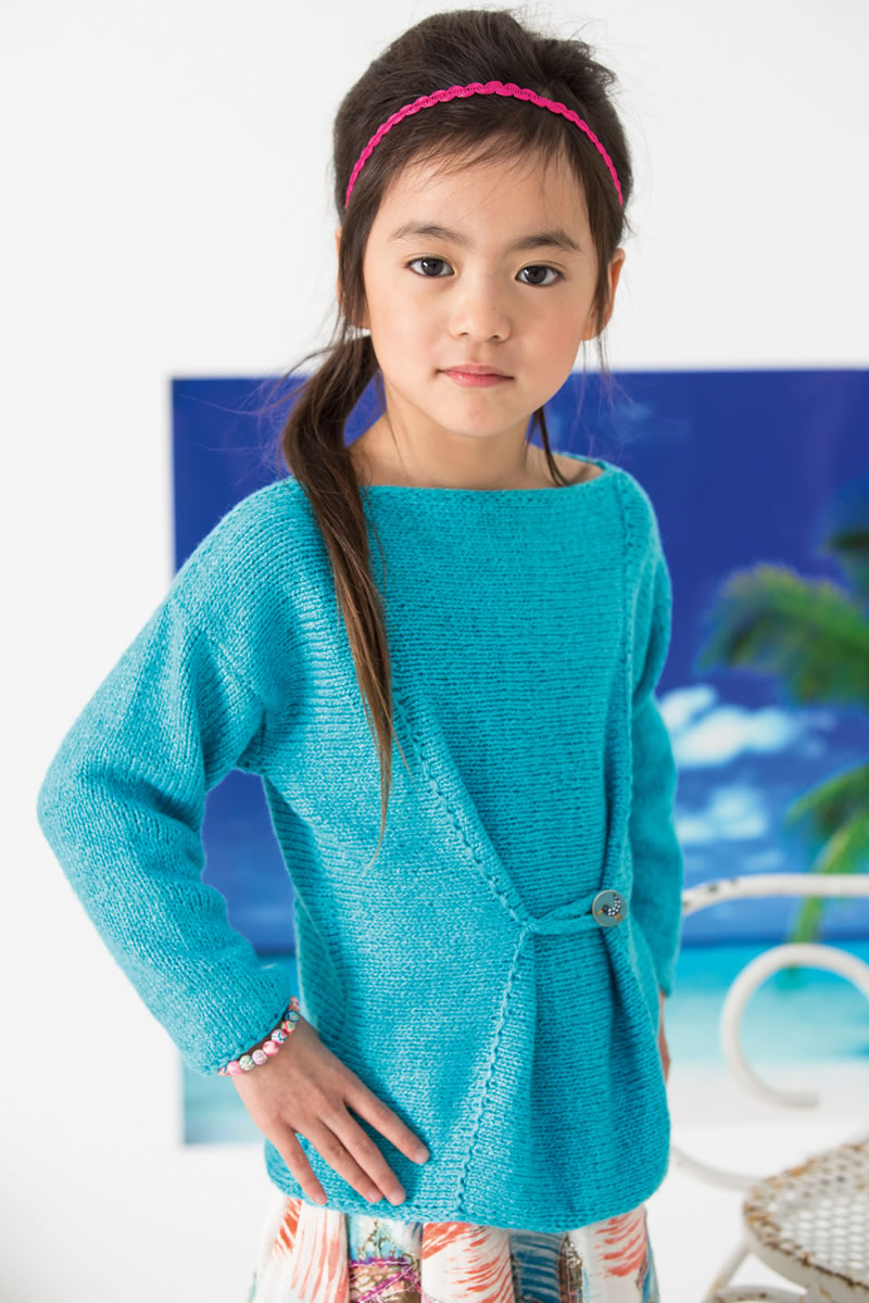 Lana Grossa Qualität „Linarte“ (40 % Viskose, 30 % Baumwolle, 20 % Leinen, 10 % Polyamid, LL = 125 m/50 g), ca. 300 (350) g Türkis (Fb 39), Stricknadeln Nr. 4, 2 Spielstricknadeln Nr. 4; 1 Knopf von JIM KNOPF, Art.: 12290, Fb 2, Gr. 20 mm.