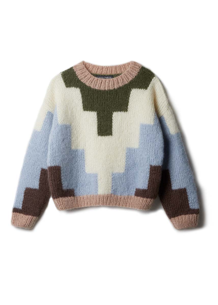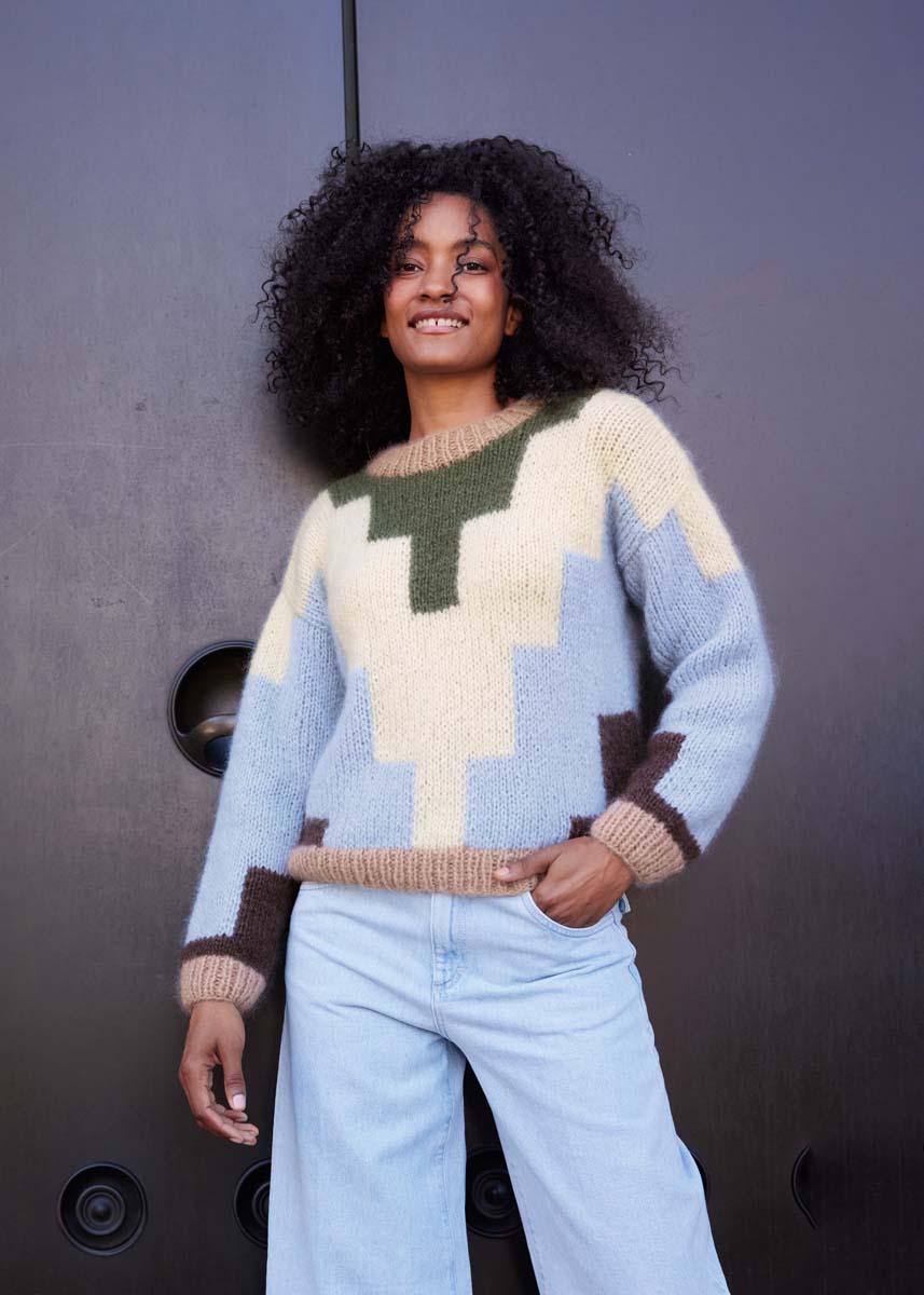 Lana Grossa Mohair di Gio (55% mohair (superkid), 45% ren ny ull (merino superfin), løpelengde = ca. 85 m/50 g), 200 (250 - 250) g i pastellblå (farge 10), 100 (150 - 150) g i gråbrun (farge 7), 100 (150 - 150) g i råhvit (farge 9), 50 (50 - 100) g i bregnegrønn (farge 14) og 50 g i beige (farge 8). Tips: Ved fargeflater 1 og 2, vennligst merk den endrede tegnforklaringen for fargene.