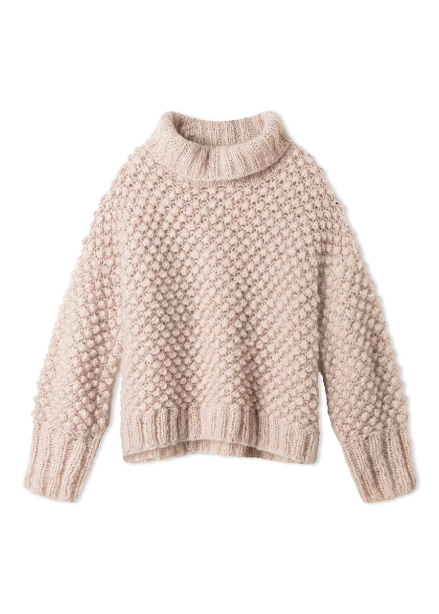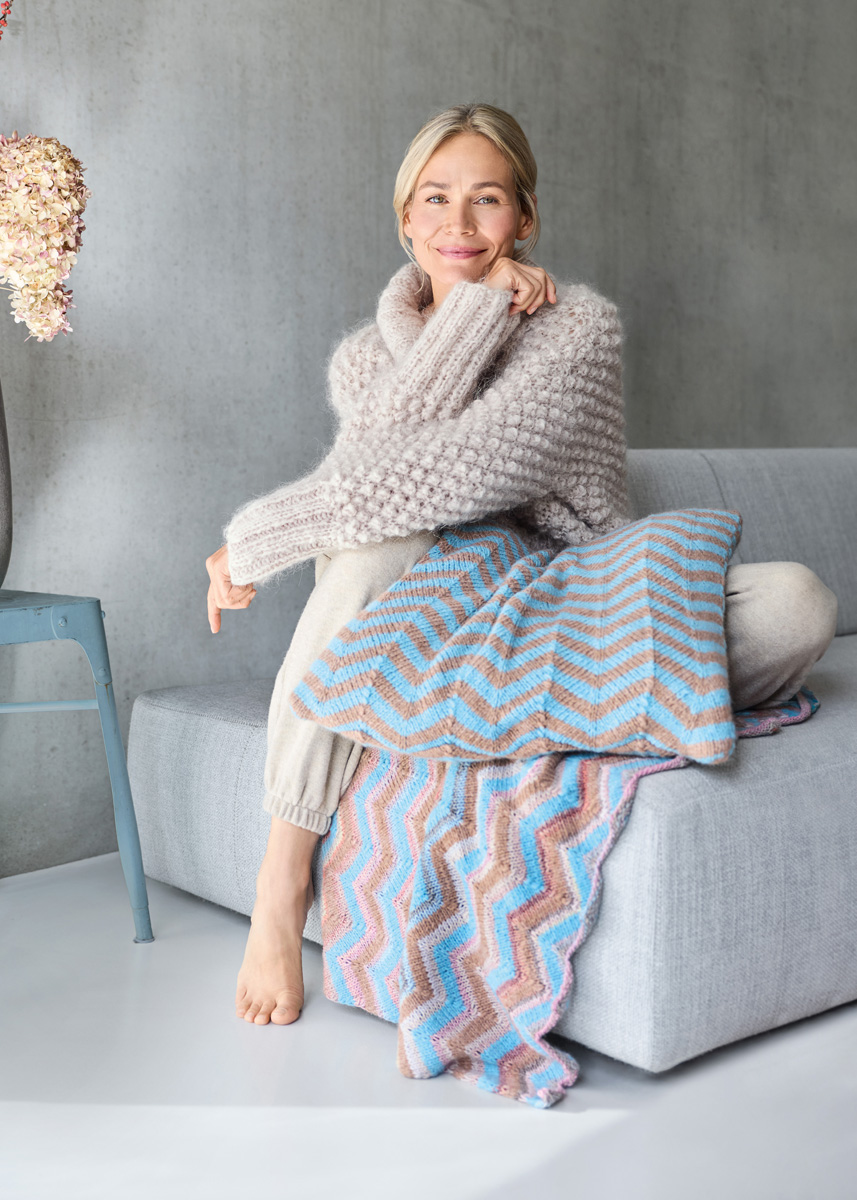 Lana Grossa-kvalitet „Mohair Moda” (70 % mohair (kid mohair), 20 % ren ny ull (merino superfine), 10 % polyamid, løpelengde = ca. 140 m/50 g): ca. 600 (650 – 700) g beige (farge 11); pinner nr. 7 og 10, hver 1 rundpinne nr. 7 og 10, 60 cm lang, strømpepinner nr. 7. Merknad: Strikk alt med dobbelt garn!