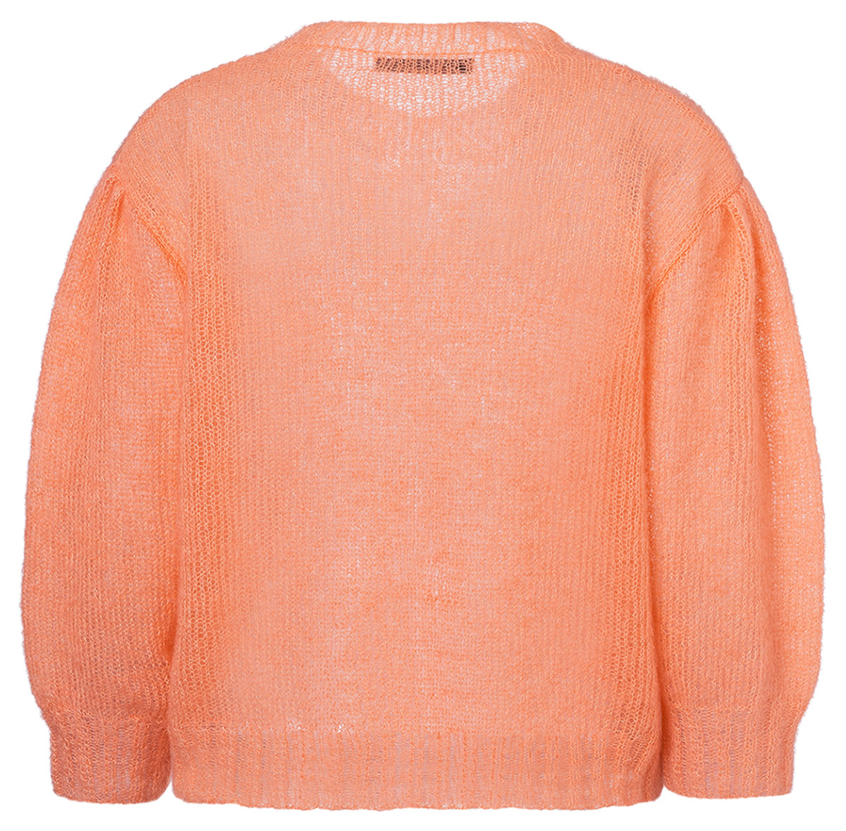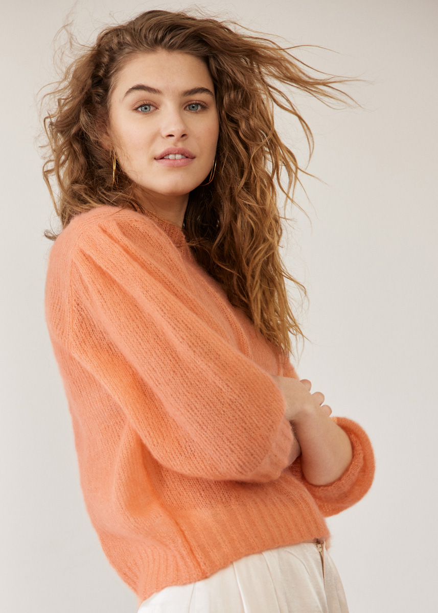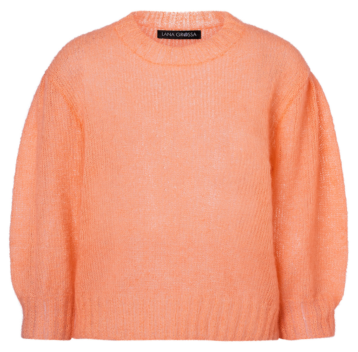 Lana Grossa Silkhair (70% mohair, 30% silke, löplängd 210 m/25 g), 125 (150 – 175) g lax (färg 159); stickor nr. 3 och 4, 1 rundsticka nr. 3, 40 cm lång.