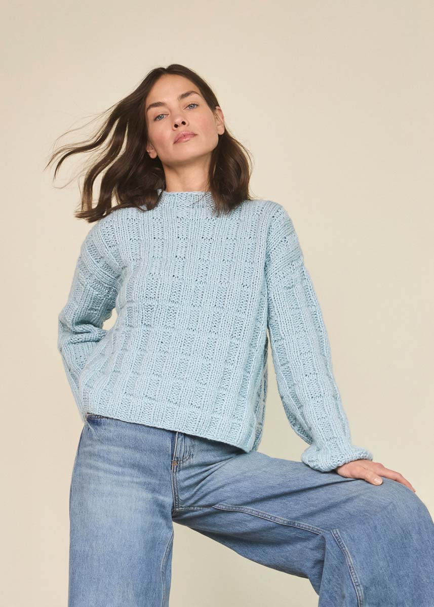Lana Grossa-kvalitet „Winter Softness“ (62 % ren ny ull (merino extrafine), 38 % bomull (bio), løpelengde = ca 70 m/50 g): 550 (600 - 650 - 700) g mintblå (farge 2); strikkepinner nr. 6 og 7; kort rundpinne nr. 6.