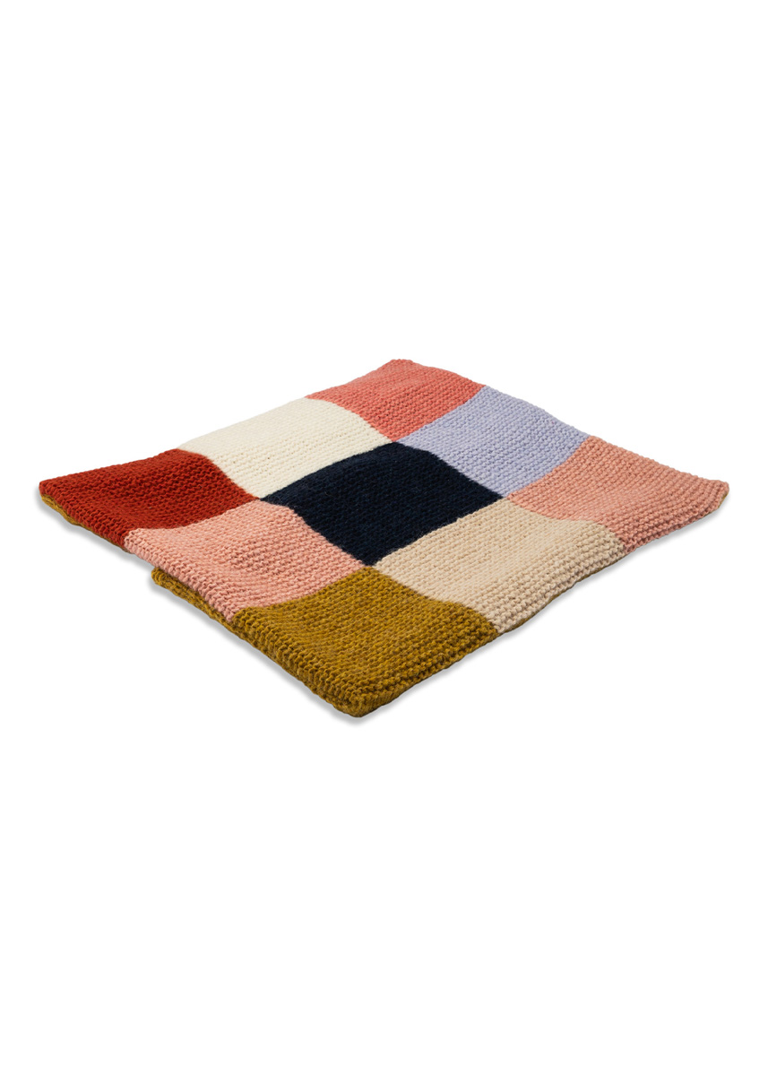 Lana Grossa-kvalitet „Brigitte No. 2” (47 % (baby) alpakka, 45 % bomull, 8 % ren ny ull (merino), løpelengde = ca. 140 m/50 g): ca. 100 g sennepgul (farge 67) og ca. 50 g hver i nattblå (farge 5), råhvit (farge 16), laks (farge 46), lysbeige (farge 47), fersken (farge 55), rust (farge 59) og sartlilla (farge 78); strikkepinner nr. 6; 1 vaskbart puteinnlegg, 50 x 50 cm.