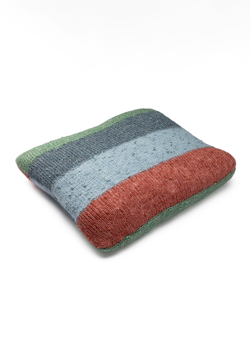 Lana Grossa-kvalitet „Lucciola” (29 % polyamid, 24 % ren ny ull (merino Fine), 22 % viskose, 20 % (baby) alpakka, 5 % metalliske fibre, løpelengde = ca. 130 m/50 g): hver ca. 50 g grønn (farge 3), gråblå (farge 4), lysblå (farge 5) og terrakotta (farge 9); pinner nr. 5; 1 vaskbart puteinnlegg, 45 x 45 cm.
