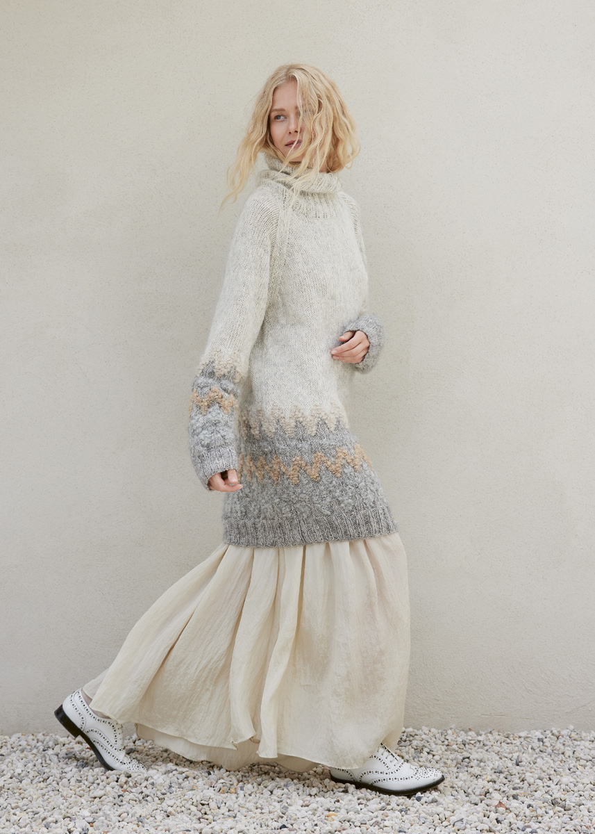 Garn: Lana Grossa Natural Alpaca Pelo (63 % bomull, 31 % alpakka (baby), 6 % ren ny ull (merino), LL = 125 m/50 g): 300 (350 / 350 / 400) g natur/lys grå (frg 2) og 150 (200 / 200 / 250) g lys grå melert (frg 3) og Lana Grossa Orsetto (60 % ren ny ull (merino), 40 % alpakka (superfine), LL = 75 m/50 g: 100 (100 / 100 / 150) g lys grå (frg 14), 50 (50 / 50 / 100) g beige (frg 6) og 50 (100 / 100 / 100) g grège (frg 7). Pinner: Rundpinne 6 mm, 80–100 cm lang (strikk omg med liten omkrets enten med teknikken magic loop eller på en ekstra kort rundpinne 6 mm).
