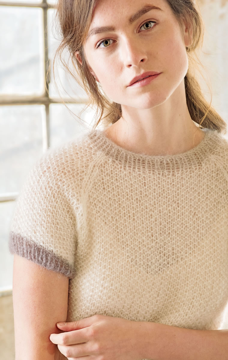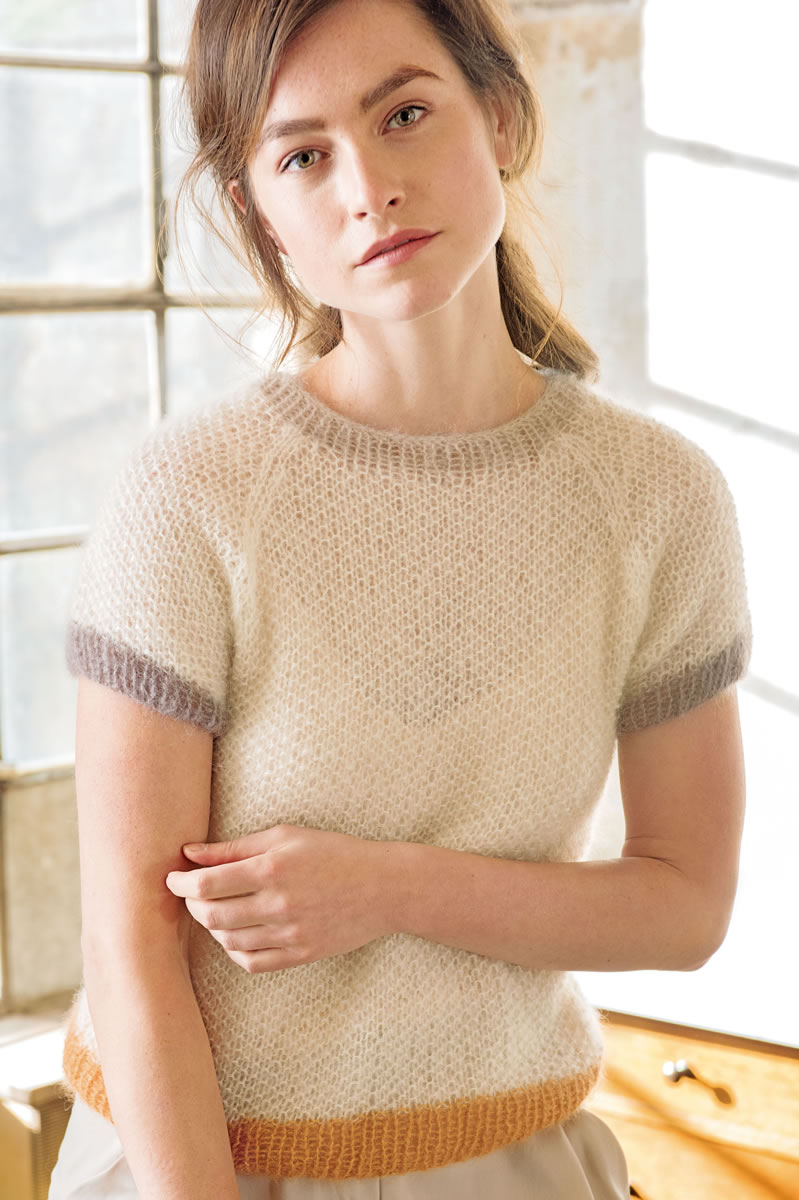 Lana Grossa-Qualität „Silkhair“ (70 % Mohair Superkid, 30 % Seide, LL = ca. 210 m/25 g), 100 (125) 125 g Rohweiß (Fb 52), 25 g Cognac (Fb 95), 25 g Taupe (Fb 35) und 25 g Natur/Grége meliert (Fb 701). Je 1 lange Rundstrick-Nd Nr 6 und Nr 6,5, 1 kurze Rundstrick-Nd Nr 5.