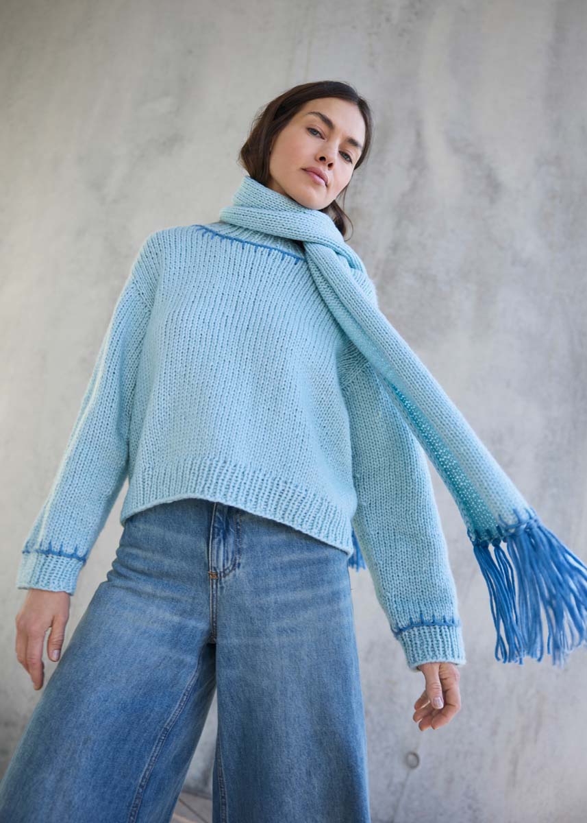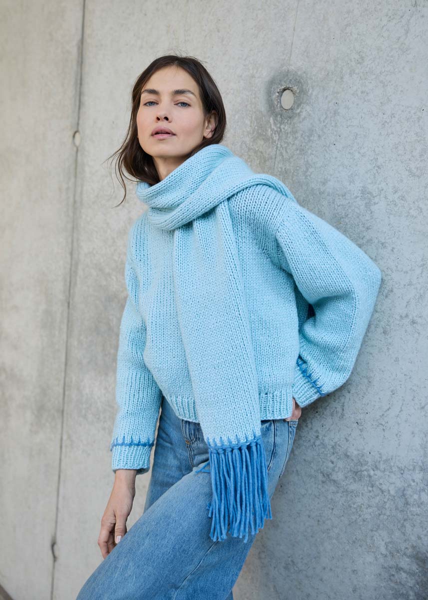 Lana Grossa-kvalitet „Winter Softness“ (62 % ren ny ull (merino extrafine), 38 % bomull (bio), løpelengde = ca 70 m/50 g): 200 g mintblå (farge 2) og 50 g dueblå (farge 7); strikkepinner nr. 7; 1 heklenål nr. 7; 1 butt stoppenål.