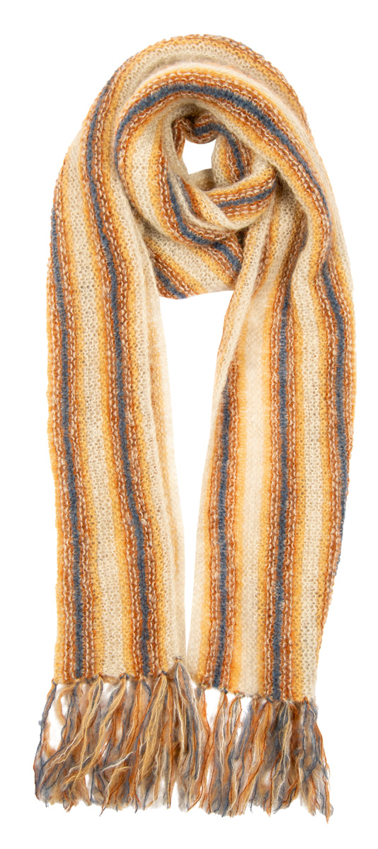 Lana Grossa kvalitet „Brigitte No. 3“ (20% mohair (superkid), 57% ren ny ull, 23% pamid, löplängd= 100 m/25 g): 75 g ljus beige (färg 18), 25 g kamel (färg 19), 25 g rost (färg 46), 25 g rökblå (färg 49), rundsticka nr. 6 vajerlängd 120 cm, virknål nr. 5.