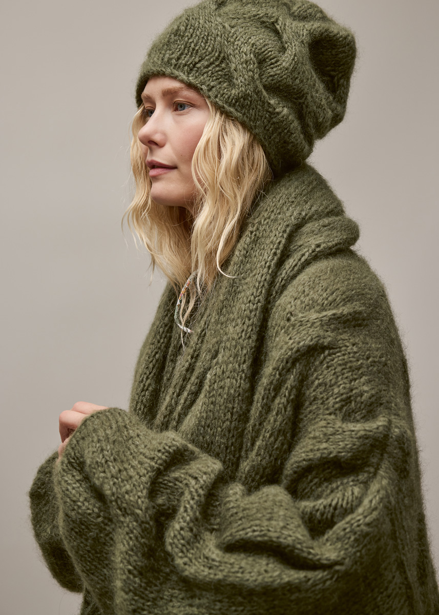 Garn: Lana Grossa Mohair di Gio (55 % mohair (superkid), 45 % ren ny ull (merino superfine), LL = 85 m/50 g): 350 g bregnegrønn (frg 14) Pinner: Rundpinne 6 og 7 mm, en flettepinne