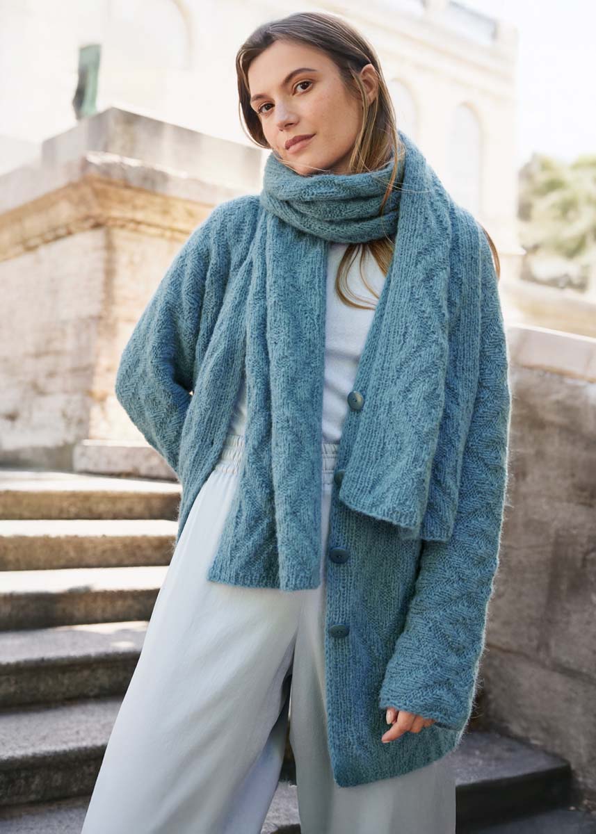 Lana Grossa Nebbia (55% ny ull (merino ekstrafin), 45% (baby) alpakka, løpelengde 170 m/50 g), 200 g i dueblå (farge 5); strikkepinner nr. 5.