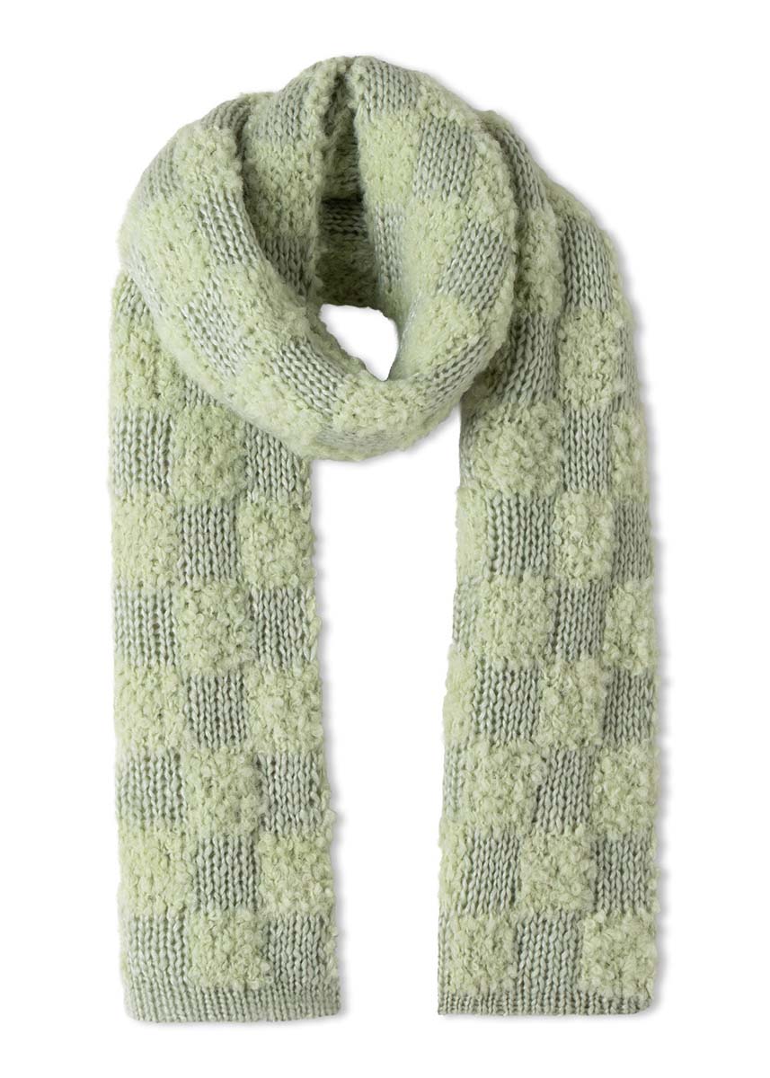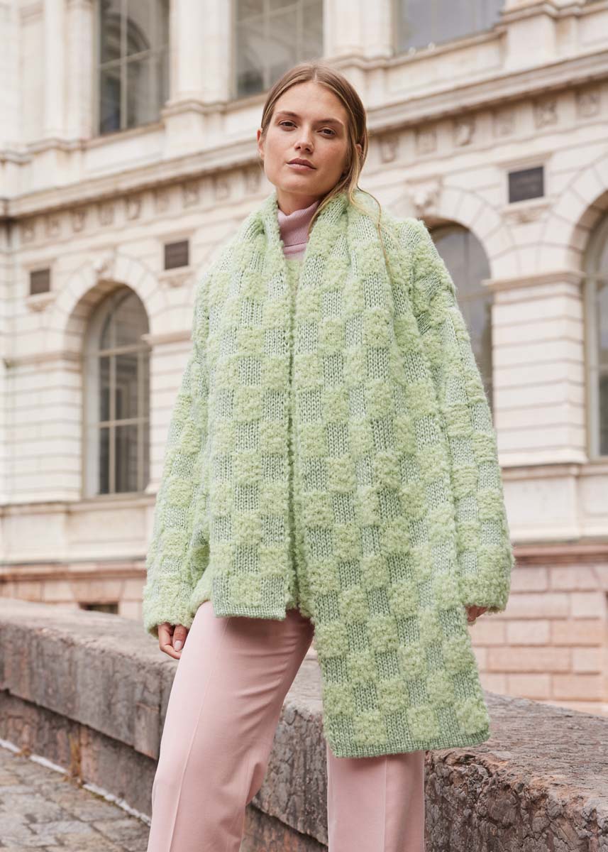 Lana Grossa Orsetto (60% ny ull (merino), 40% alpakka (superfin), løpelengde 75 m/50 g), 200 g i hvitgrønn (farge 10) og Lana Grossa Lucida (58% ny ull (merino), 42% viskose, løpelengde 100 m/50 g), 200 g i hvitgrønn (farge 19); 2 rundpinner nr. 6, 60 cm lang; 1 rundpinne nr. 7, 60 cm lang; 1 heklenål nr. 7; 1 ullnål.