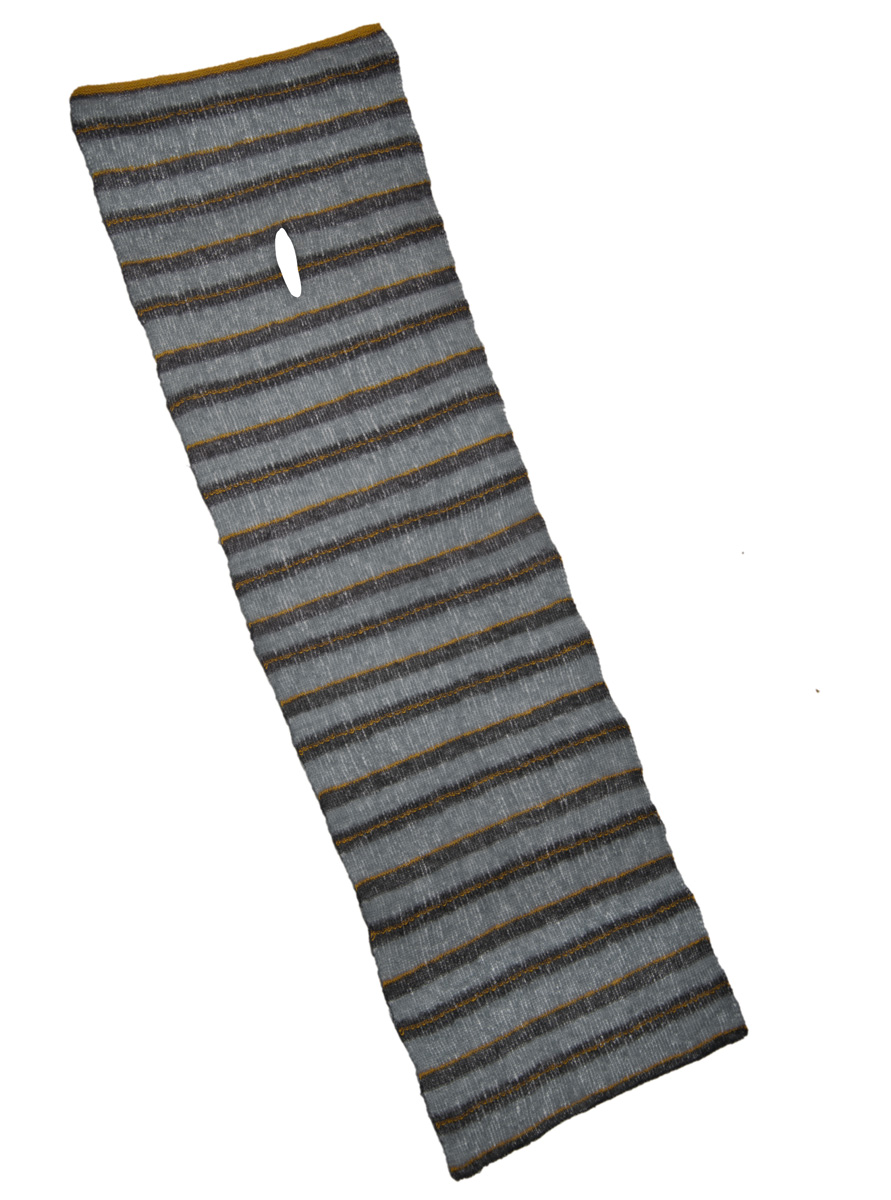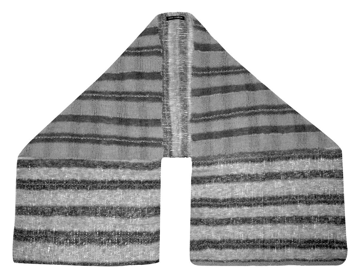 Lana Grossa Silkhair (70% mohair, 30% silke, løpelengde 210 m/25 g), 75 g grafittgrå (farge 94) und 50 g skifer (farge 84); Lana Grossa Ecopuno (72% bomull, 17% jomfru ull, 11% baby alpakka, løpelengde 215 m/50 g), 50 g guloransje (farge 33); pinner nr. 5,0.