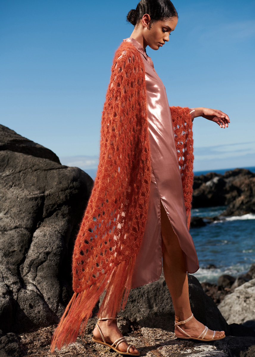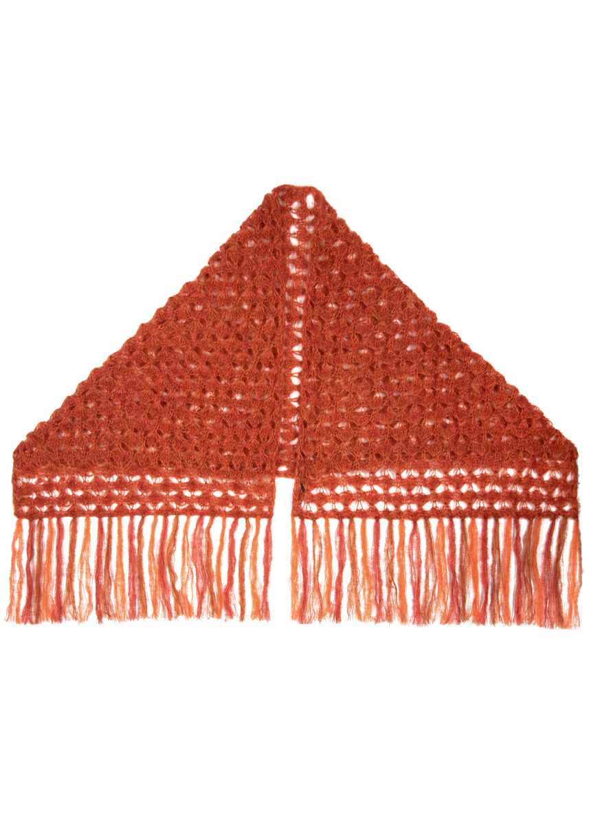 Lana Grossa-kvalitet „Silkhair” (70 % mohair (superkid), 30 % silke, løpelengde = ca. 210 m/25 g): ca. 75 g hver av rød (farge 145), kanel (farge 124) og oransje (farge 125); strikkepinner nr. 9, 1 heklenål nr. 5 (til frynsene).