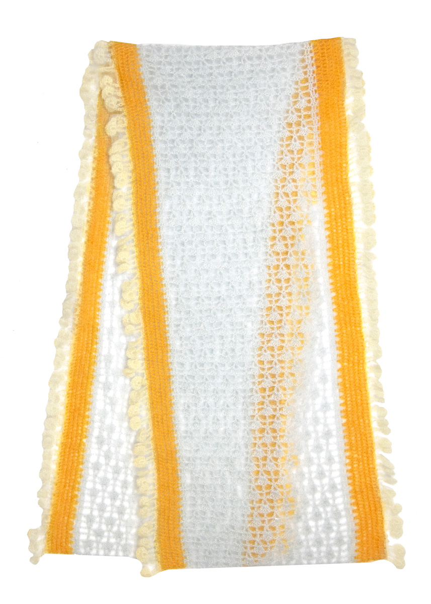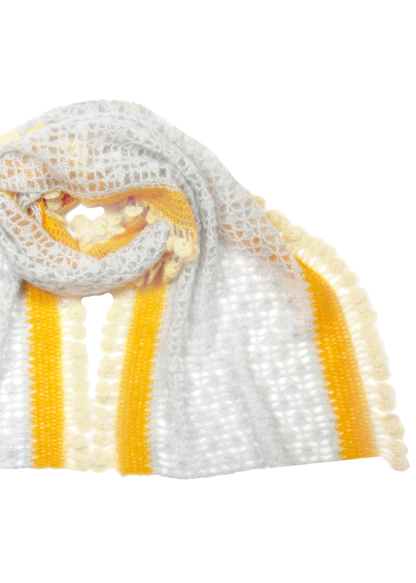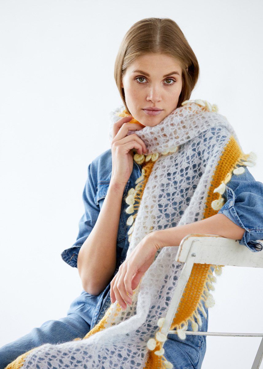 Lana Grossa Silkhair (70% mohair, 30% silke, løpelengde 210 m/25 g), 75 g sølvgrå (farge 41), 50 g rav (farge 146) og 50 g råhvit (farge 52); 1 heklenål nr. 4.