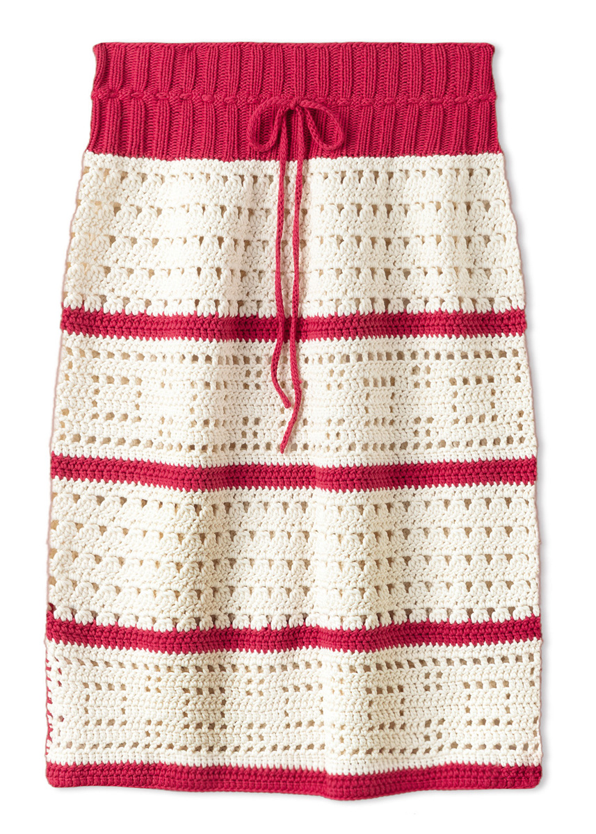 Garn: Lana Grossa «Promessa» (70 % bomull (bio), 30 % polyamid (resirkulert), LL = ca. 125 m/50 g): Ca. 350 (450) g krem (frg 14) og ca. 100 (150) g orientrød (frg 1). Heklenål/ pinner: Heklenål nr. 5, kort rundpinne nr. 3,5