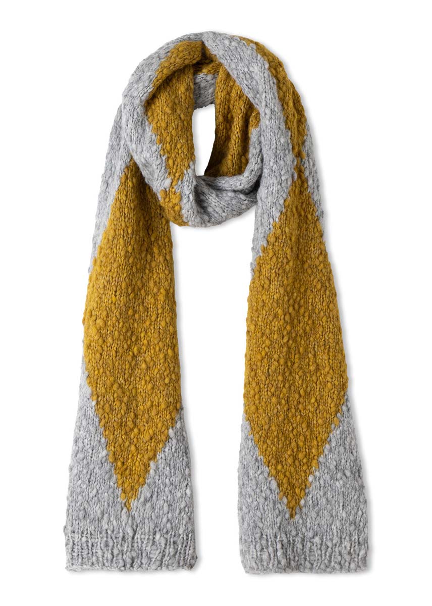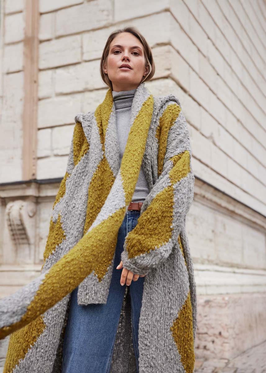 Lana Grossa Caramella (53% ny ull (merino), 25% (baby) alpakka, 22% polyamid, løpelengde 110 m/50 g), 150 g i lys grå (farge 12) og 100 g i sennepgul (farge 6); strikkepinner nr. 5.