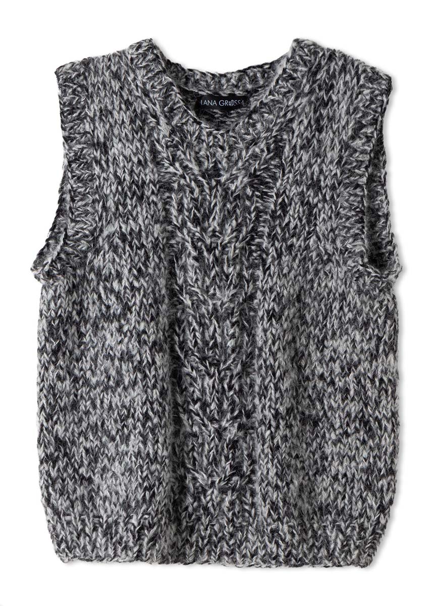 Lana Grossa Brigitte No. 2 (47% alpakka (baby), 45% bomull, 8% ny ull (merino), løpelengde 140 m/50 g), 150 (150 - 200) g i svart (farge 36) og Lana Grossa Mohair Moda (70% mohair (kid mohair), 20% ren ny ull (merino superfin), 10% polyamid, løpelengde 140 m/50 g), 150 (150 - 200) g i råhvit (farge 18); strikkepinner nr. 6 og nr. 8; 1 rundpinne nr. 6, 40 cm lang; 1 hjelpepinne.