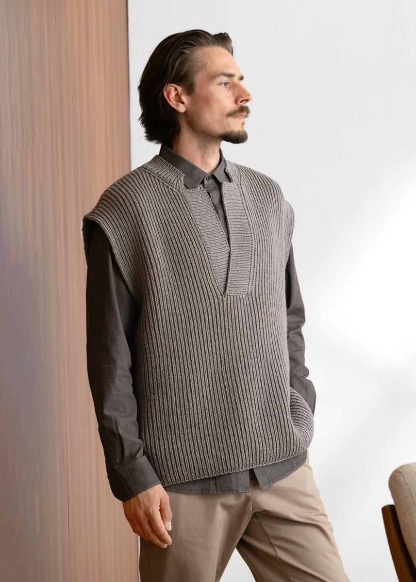 Lana Grossa Cool Wool Big (100% ren ny ull (merino exrafein), løpelengde 120 m/50 g), 700 (750 – 800) g taupe (farge 686); strikkepinner nr. 3,5 og 1 rundpinne nr. 3,5, 40 cm lang.