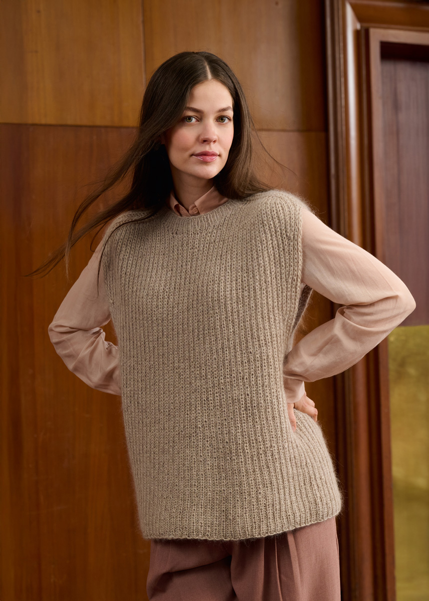 Lana Grossa Ecopuno (72% bomull, 17% ren ny ull (merino ), 11% alpakka (baby), løpelengde 215 m/50 g), 250 (300 – 350 – 400) g linbeige (farge 222) og Lana Grossa Silkhair (70% mohair (superkid), 30% silke, løpelengde 210 m/25 g), 125 (150 – 175 – 200) g beige (farge 220); 1 rundpinne nr. 4, 40, 60 og 80 cm lang, såvel som 4 maskemarkører [MM]. TIPS: Modellen strikkes med dobbel tråd, 1 tråd Ecopuno og 1 tråd Silkhair!