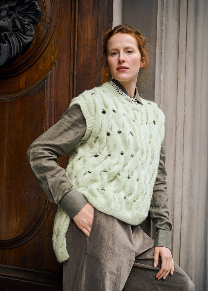 Garn: Lana Grossa «Nebbia» (55 % ren ull (merino extrafine), 45 % alpakka (baby), LL = ca. 170 m/50 g): 350 (400 - 450) g hvitgrønn (frg 9).