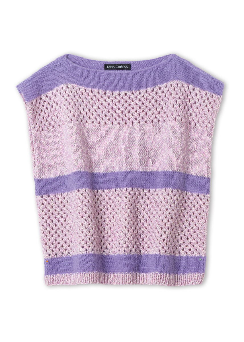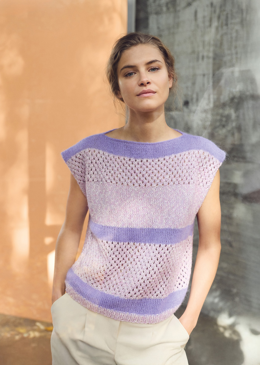 Lana Grossa-kvalitet „Setasuri“ (69 % alpakka (suri), 31 % silke, løpelengde = ca 212 m/25 g): ca 50 (50 - 50 - 75) g fiolett (farge 46); Lana Grossa-kvalitet „Bottoni“ (53 % bomull, 24 % viskose (merino), 23 % ren ny ull (merino extrafine), løpelengde = ca 125 m/50 g): ca 200 (200 - 250 - 250) g syrin/ råhvit (farge 5); pinner nr. 4,5.