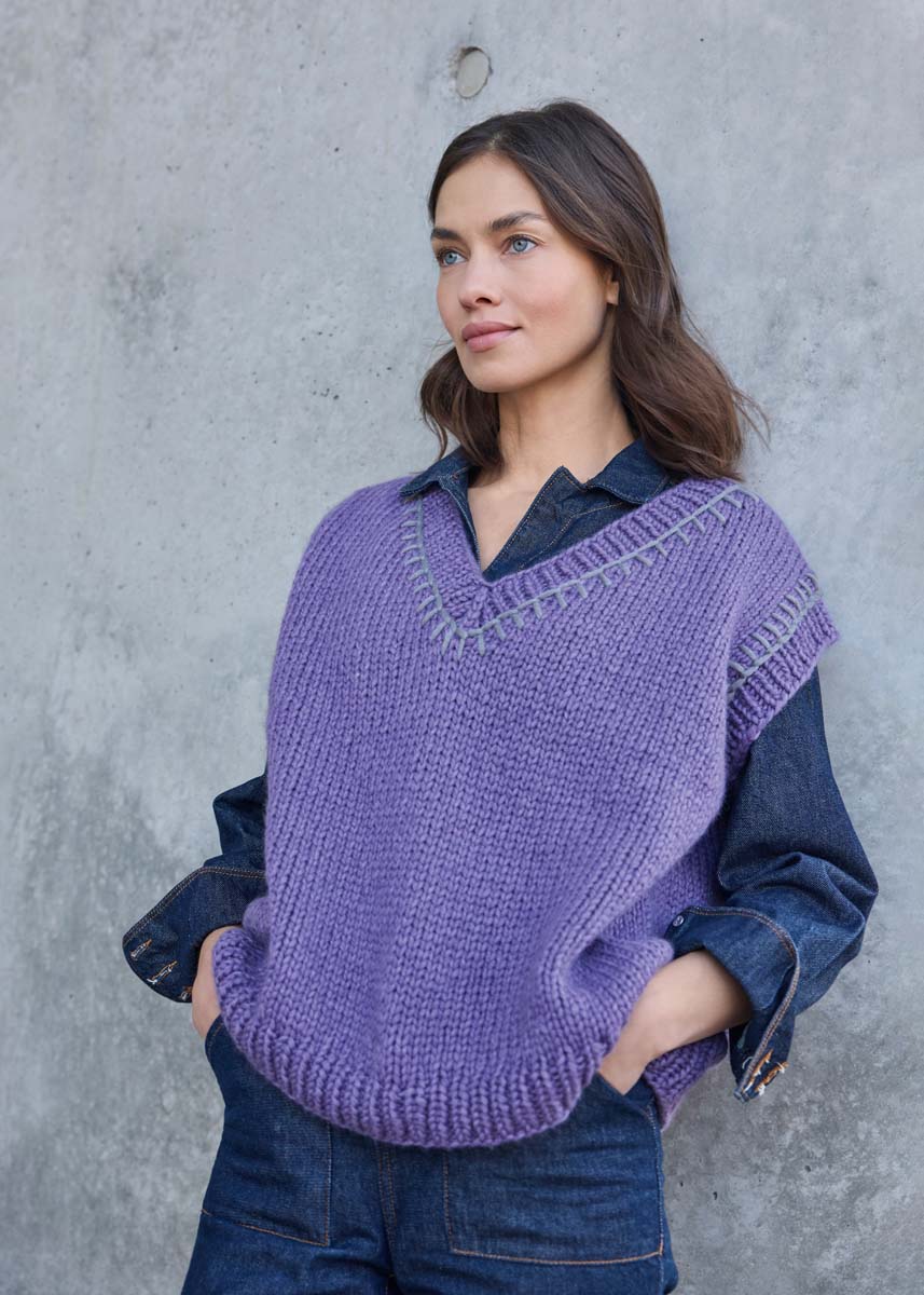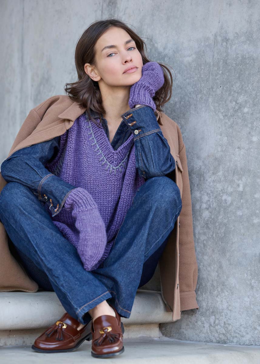 Lana Grossa-kvalitet „Winter Softness“ (62 % ren ny ull (merino extrafine), 38 % bomull (bio), løpelengde = ca 70 m/50 g): 350 (400 - 450 - 500) g fiolett (farge 8) og 50 g musgrå (farge 17); kort og lang rundpinne nr. 7 og 8; 1 butt stoppenål. Modellen strikkes ovenfra og ned, i ett stykke.