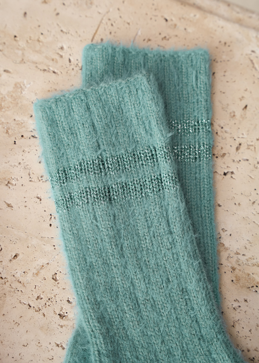 Variant A: Lana Grossa Cosy Socks (70% ren ny ull (merino), 30% polyamid, LL = ca. 400 m/100 g): 100 g lys blå (frg 4) og Brillino (83% viskose, 17% metalltråd lurex, LL = ca. 200 m/25 g): 25 g lys blå/sølv (frg 22); Variant B: Lana Grossa Cosy Socks (70% ren ny ull (merino), 30% polyamid, LL = ca. 400 m/100 g): 100 g rosa (frg 1) og Brillino (83% viskose, 17% metalltråd lurex, LL = ca. 200 m/25 g): 25 g hvit/rosa (frg 8); Variant C: Lana Grossa Cosy Socks (70% ren ny ull (merino), 30% polyamid, LL = ca. 400 m/100 g): 100 g salviegrønn (frg 6) og Brillino (83% viskose, 17% metalltråd lurex, LL = ca. 200 /25 g): 25 g turkis/sølv (frg 36). For alle varianter: Strømpepinner nr. 2,5.