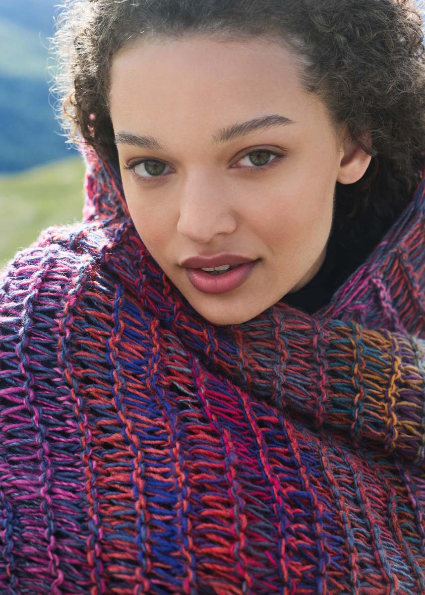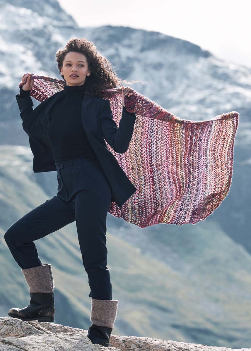 Lana Grossa-kvalitet „Gomitolo Intenso“ (50 % ren ny ull, 50 % polyacryl, løpelengde = ca 700 m/200 g): 1 nøster = ca 200 g mørkgrå/mørk-/gråblå/Petrol/Rosenholz/blåfiolett/grågrønn (farge 231) og 1 nøster = ca 200 g pink/pinklilla/okergul/gullgul/jordbær/terrakotta(farge 238); strikkepinner nr. 9. Stolaen strikkes med dobbel tråd – én tråd av hver farge.