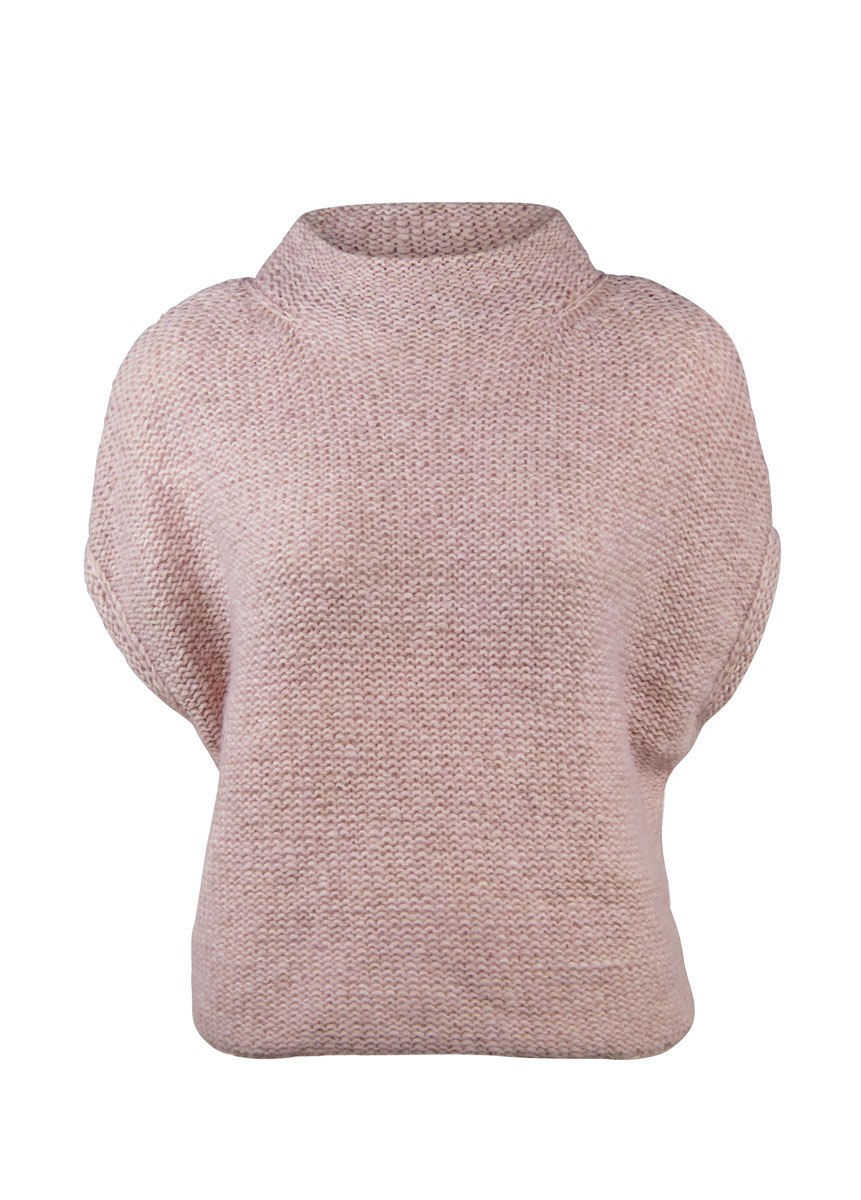 Lana Grossa-kvalitet ”Brigitte No. 2” (47 % alpaka, 45 % bomuld, 8 % ren ny uld, løbelængde = ca. 140 m / 50 gr.): ca. 250(250-300) gr gammelrosa (fv 12), strikkepinde nr. 5 og 7, rundpind nr. 7, 40 cm