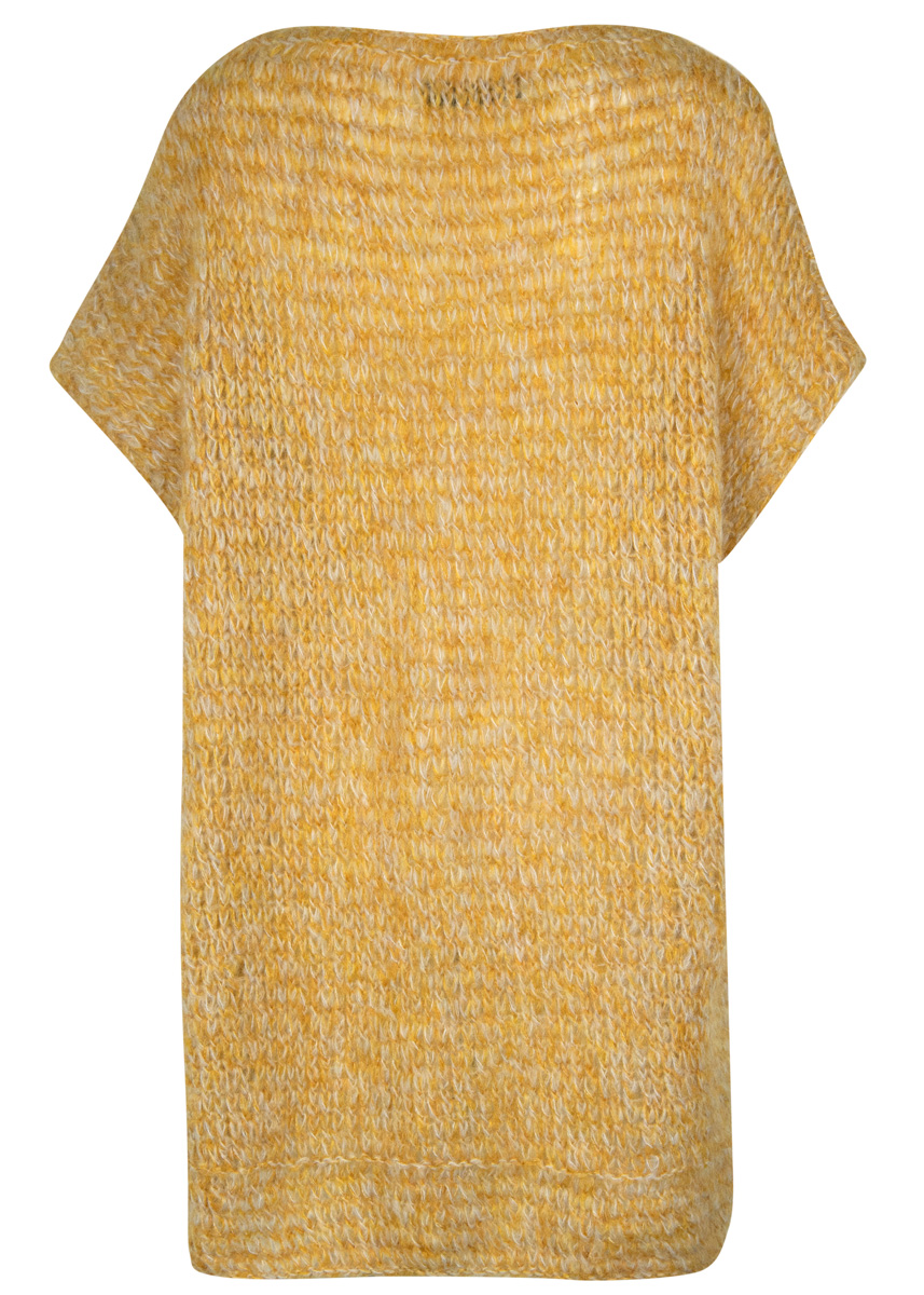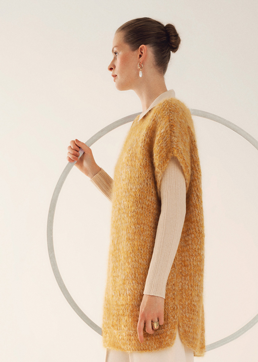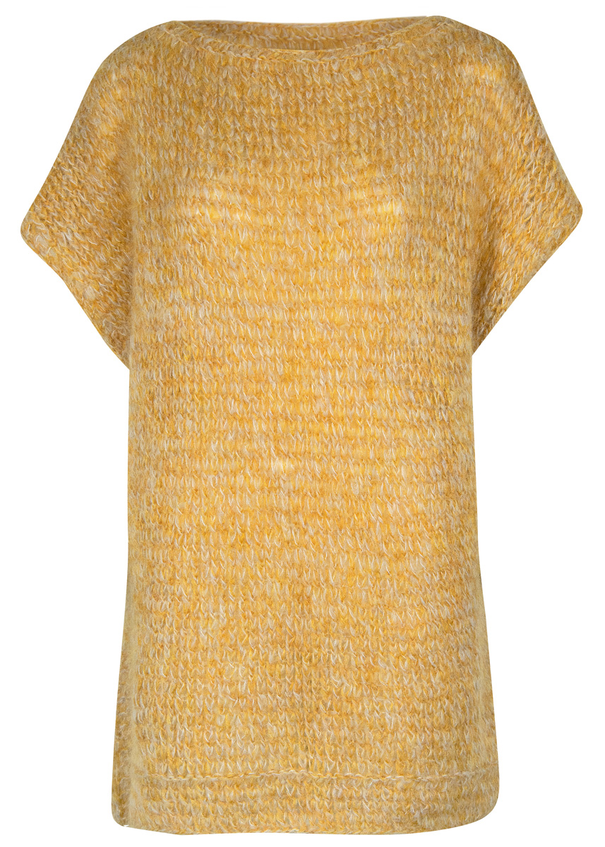 Lana Grossa-kvalitet ”Brigitte No. 3” (40 % mohair, 37 % ren ny uld, 23 % polyamid, løbelængde = ca. 100 m / 25 gr.): ca. 125(150-175) gr karry (fv 22) og grège (fv 34), strikkepinde nr. 6 og 12.