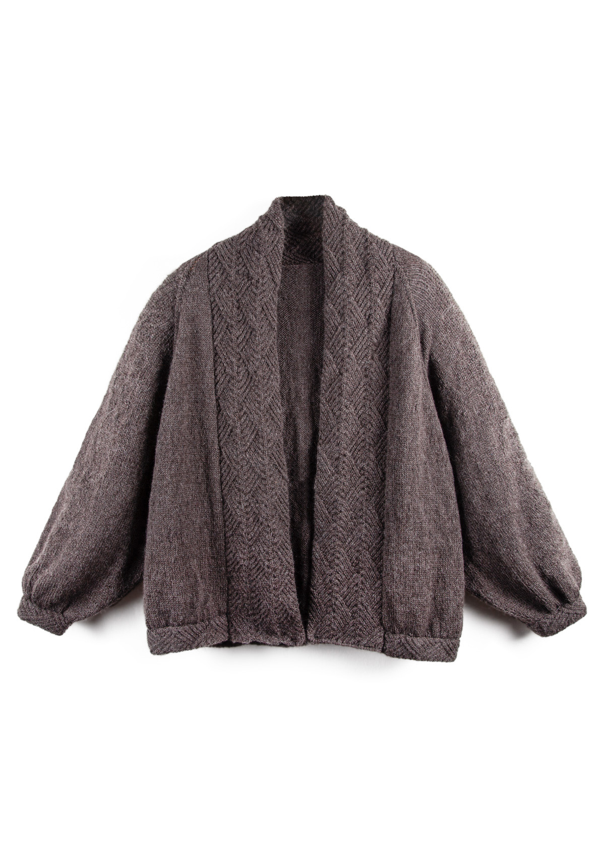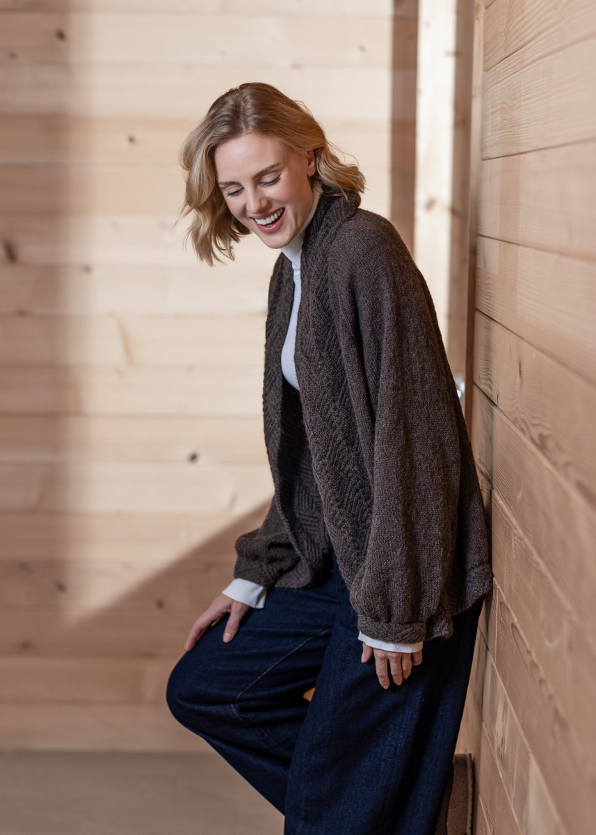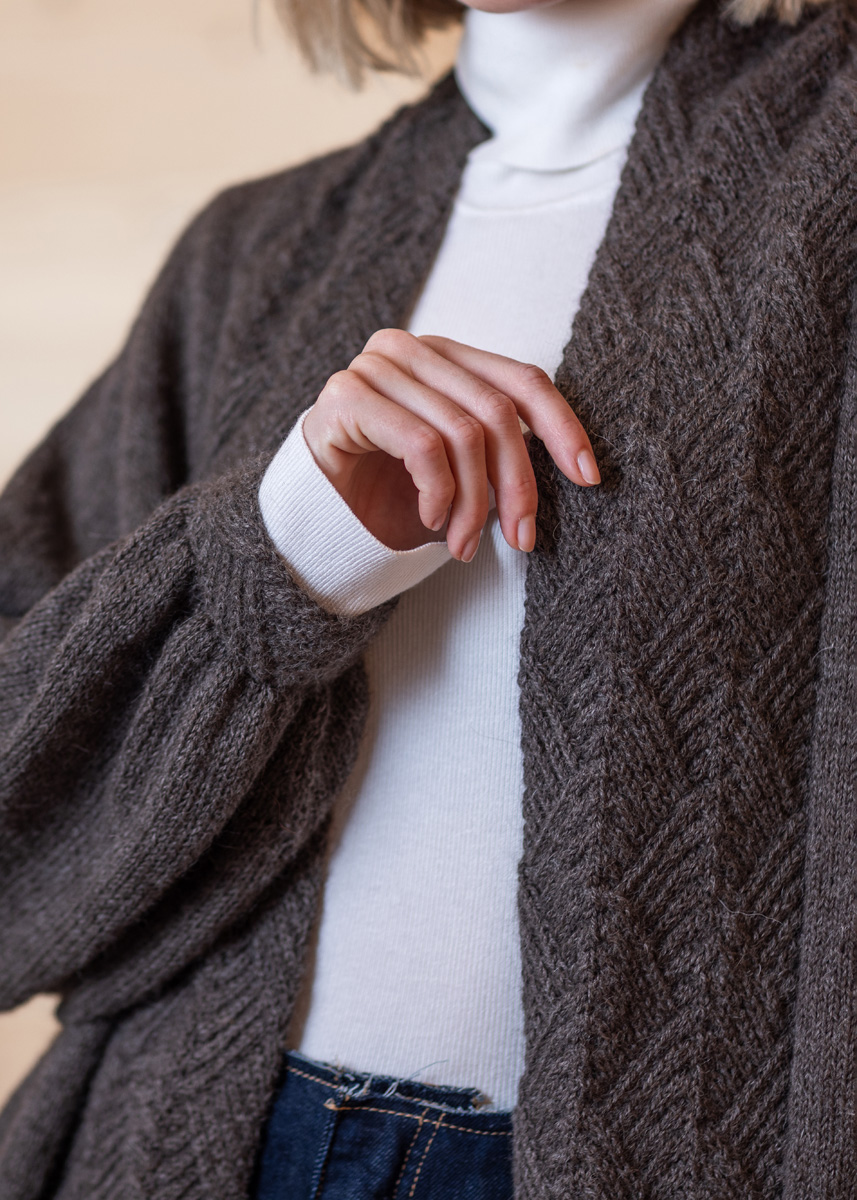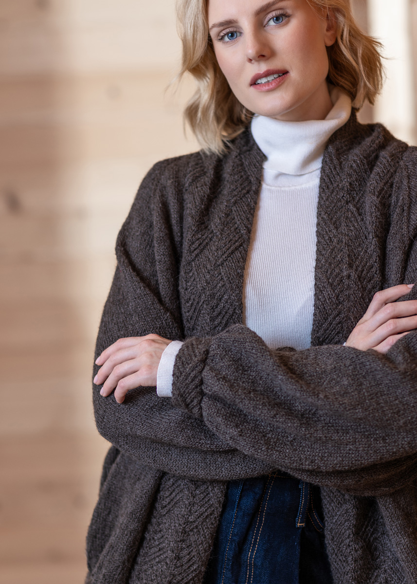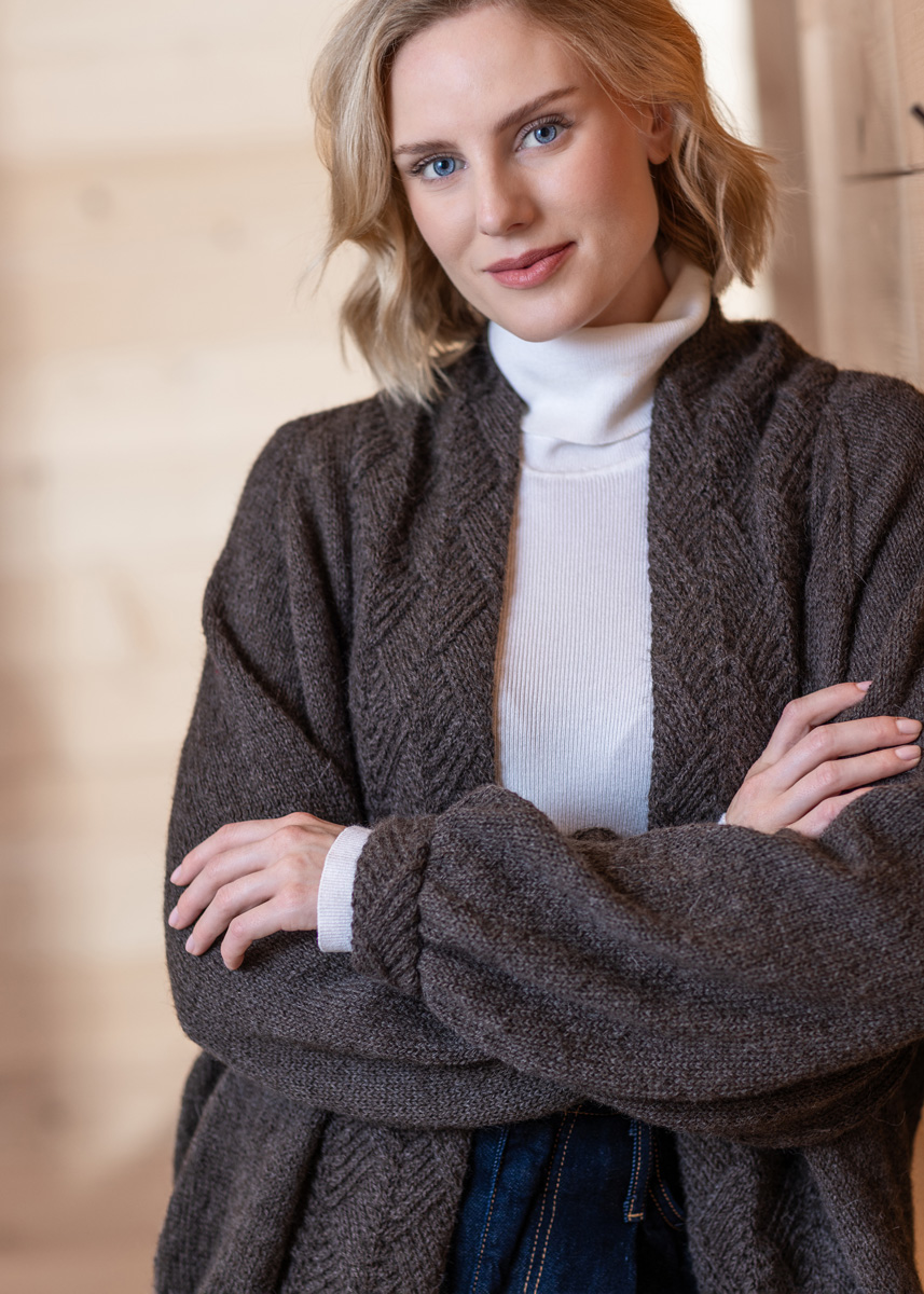Cardiganen strikkes i ett stykke ovenfra og ned. Kantene og vrangbordene strikkes separat og sys deretter på. Modellen har en total lengde på 65 (73) cm og har en brystvidde som er 62,5 - 46,5 cm større enn en brystomkrets på 80 - 96 cm (41-18 cm større enn en brystomkrets på 104 -128 cm).
