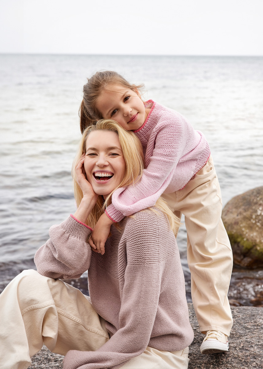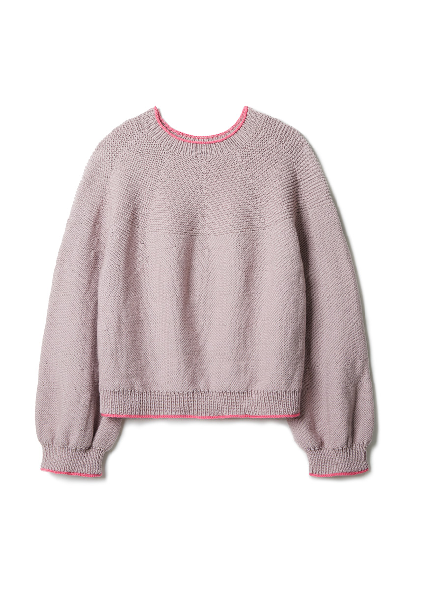 Lana Grossa Cool Wool Big (100 % ren ny ull (merino), LL = ca. 120 m/50 g), 650 (700 – 750) g grårosa (frg 1033) og 50 g bringebær (frg 1032) Pinner: Lang rundpinne (60 og 120 cm) og strømpepinner nr. 4, lang rundpinne (80, 100 og 120 cm) nr. 4,5, to hjelpepinner til å sette m til side Tilbehør: 20 maskemarkører (MM)