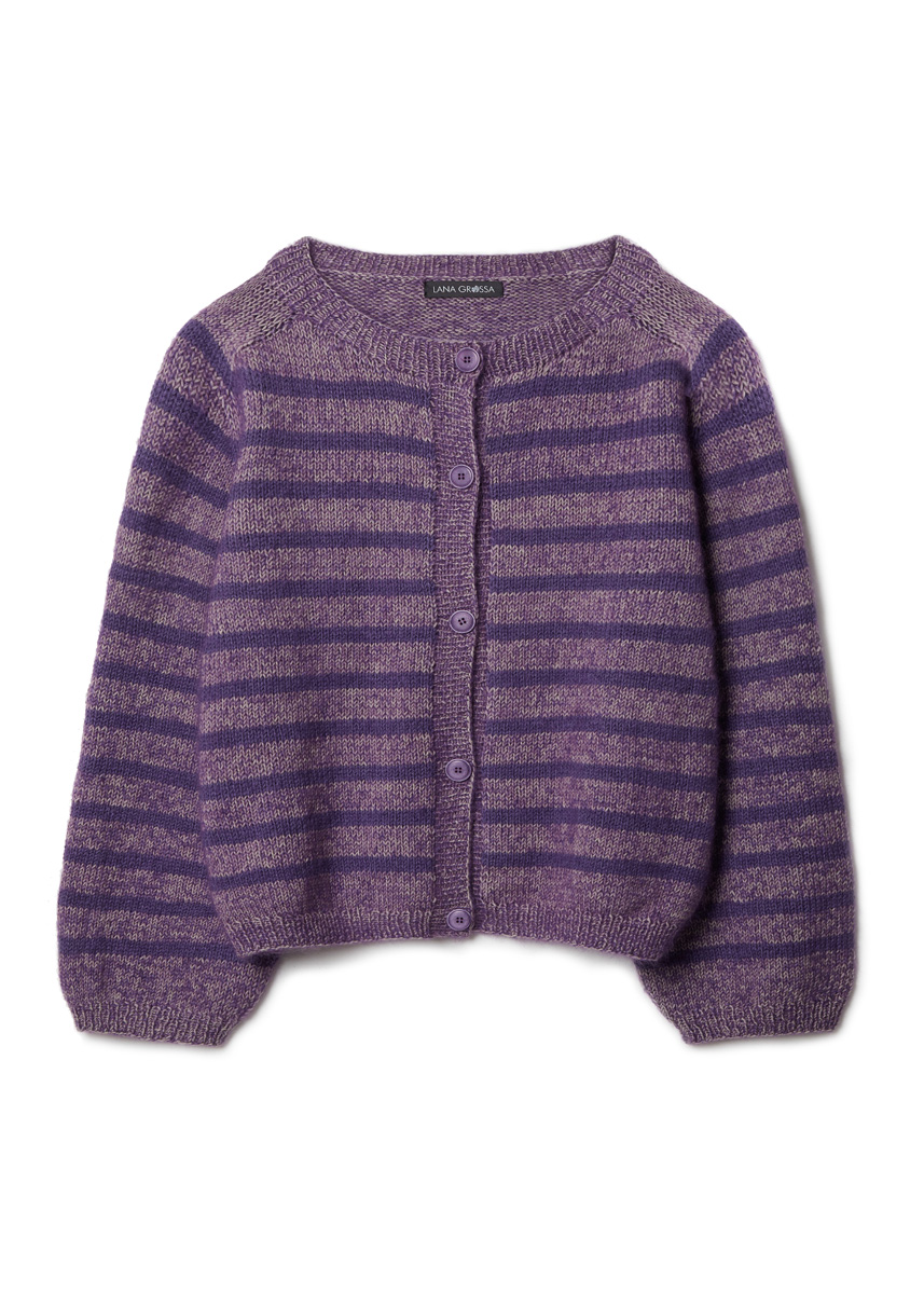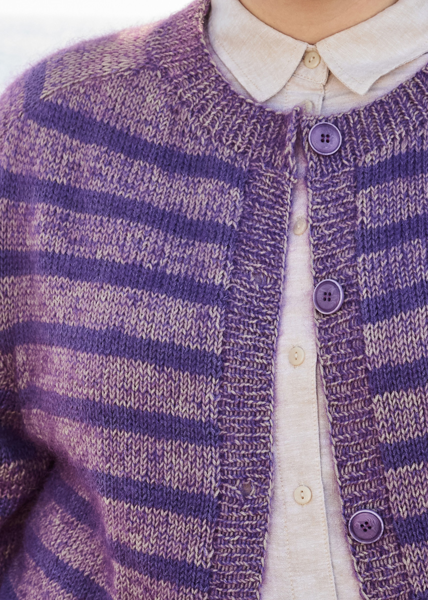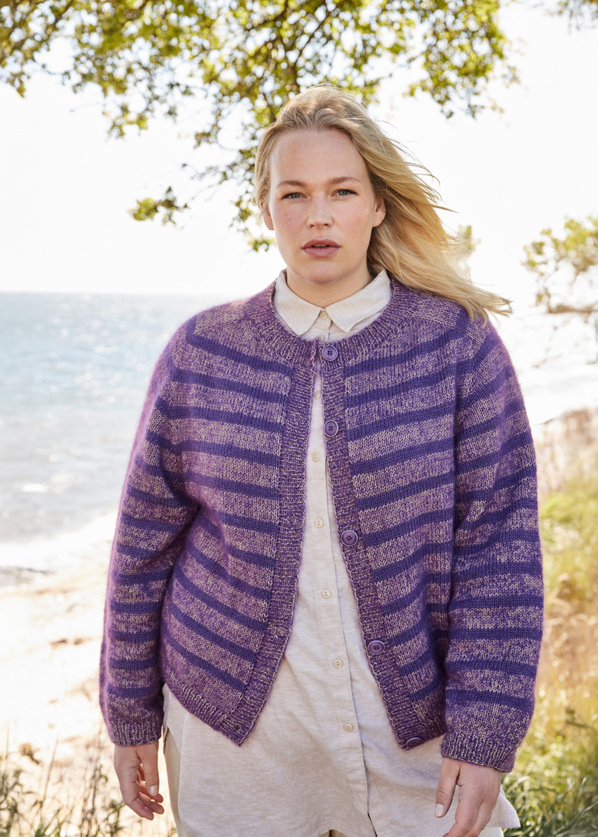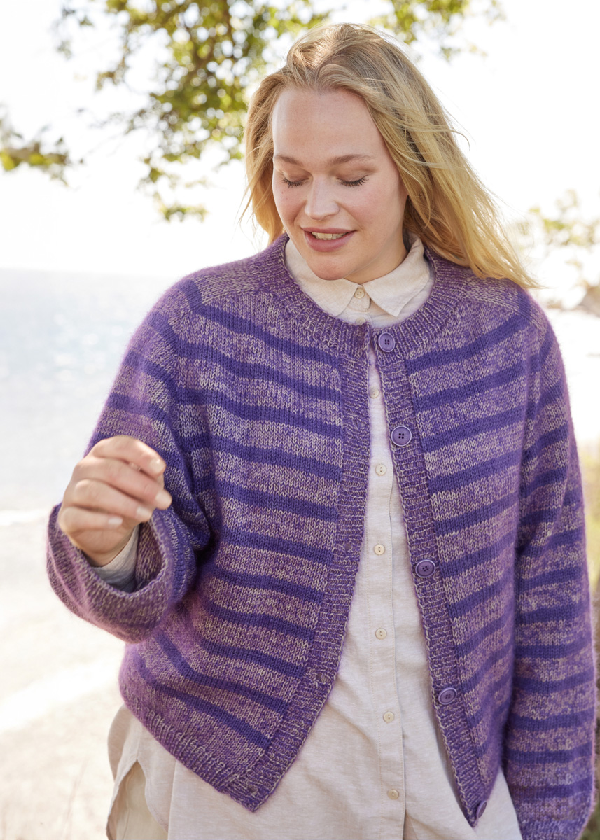 Lana Grossa Merino Superiore (100% ren ny ull (merino extrafine), LL = ca. 180 m/50 g), 300 (350 – 350 – 400) g taupe (frg 44) og 150 (150 – 200 – 250) g gråfiolett (frg 46) og Lana Grossa Silkhair (70% mohair (superkid), 30% silke, LL = ca. 210 m/25 g), 150 (175 – 200 – 225) g mørk fiolett (frg 193)
