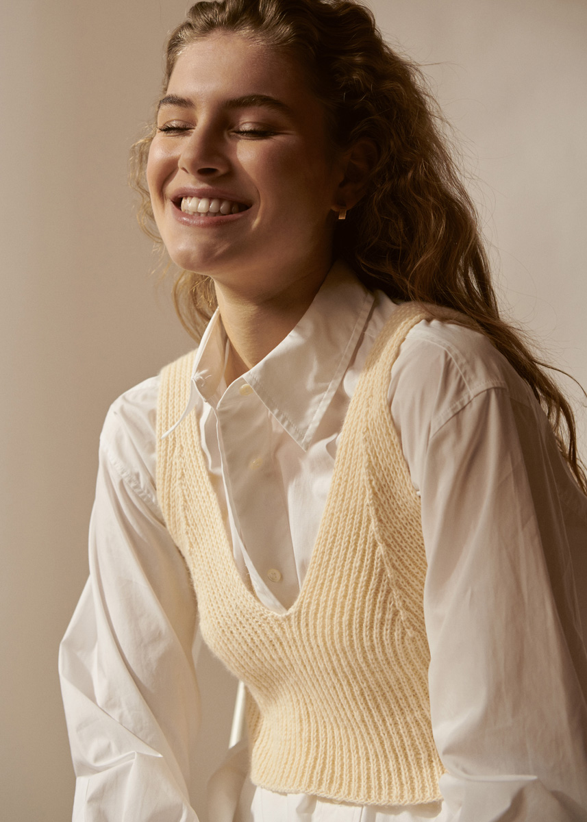 Lana Grossa-kvalitet „Ecopuno“ (72 % bomull, 17 % ren ny ull (merino), 11 % (baby) alpacka, löplängd 215 m/50 g): ca. 100 (150) g ecru (färg 46); stickor nr. 3.