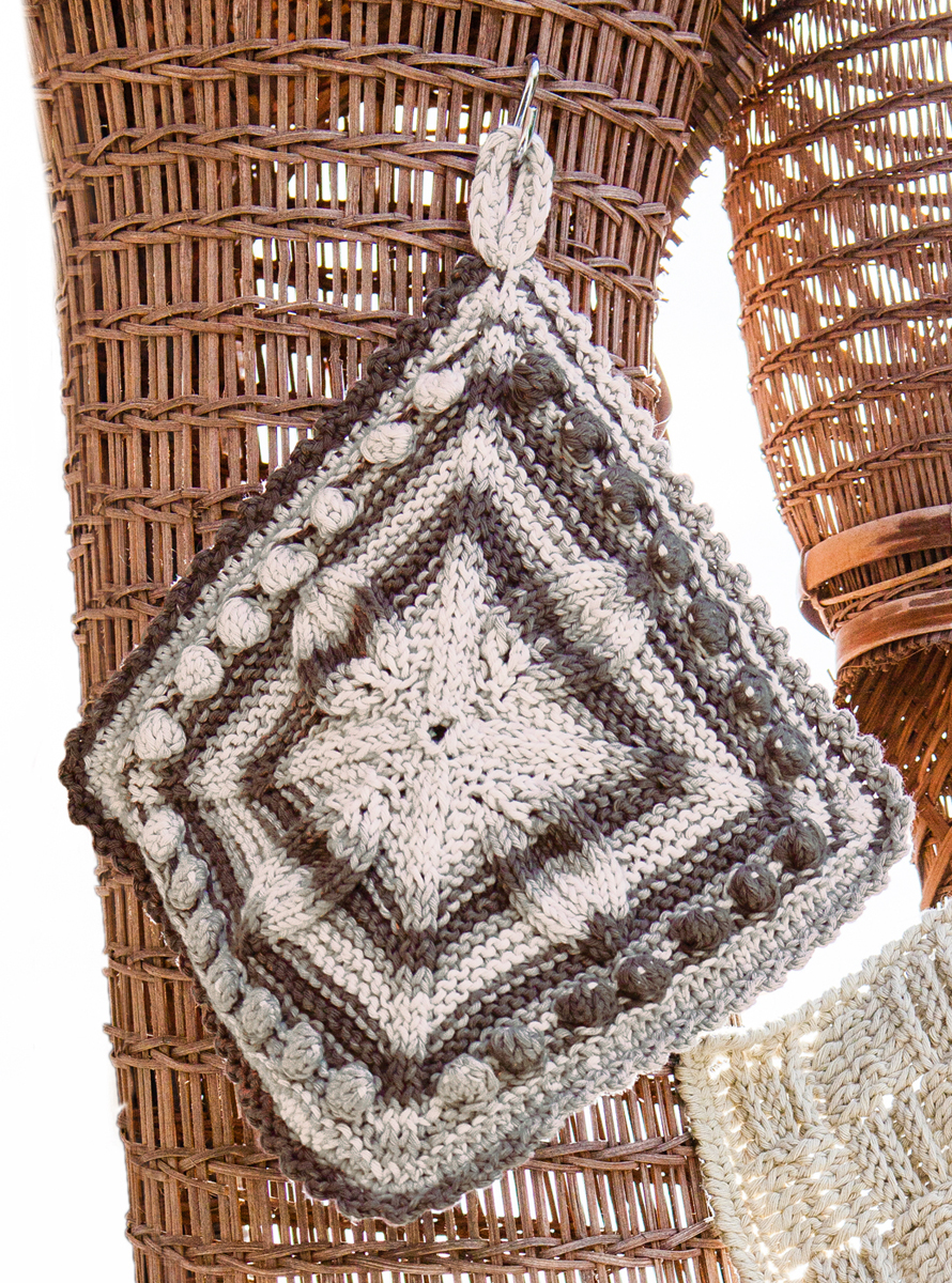 Lana Grossa-Qualität „Star Print“ (100 % Baumwolle, Lauflänge ca. 90 m/50 g): ca. 100 g Grège/Taupe/Graubraun (Fb. 706) und Lana Grossa-Qualität „Star“ (100 % Baumwolle, Lauflänge ca. 90 m/50 g): ca. 50 g Graubraun (Fb. 47); Spielstricknadeln Nr. 3,5, je 1 Rundstricknadel Nr. 3,5, 60 und 80 cm lang, 1 Wollhäkelnadel Nr. 3,5
