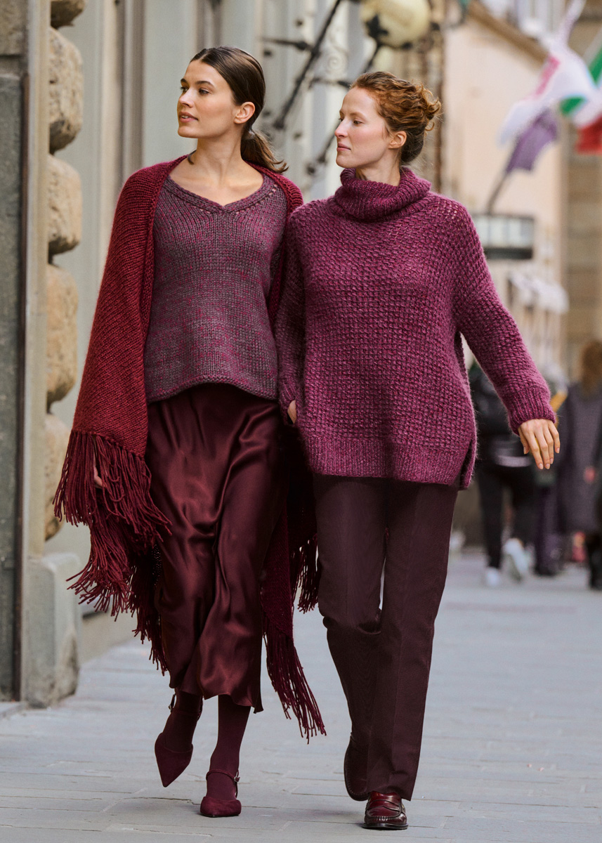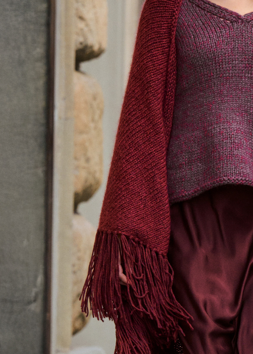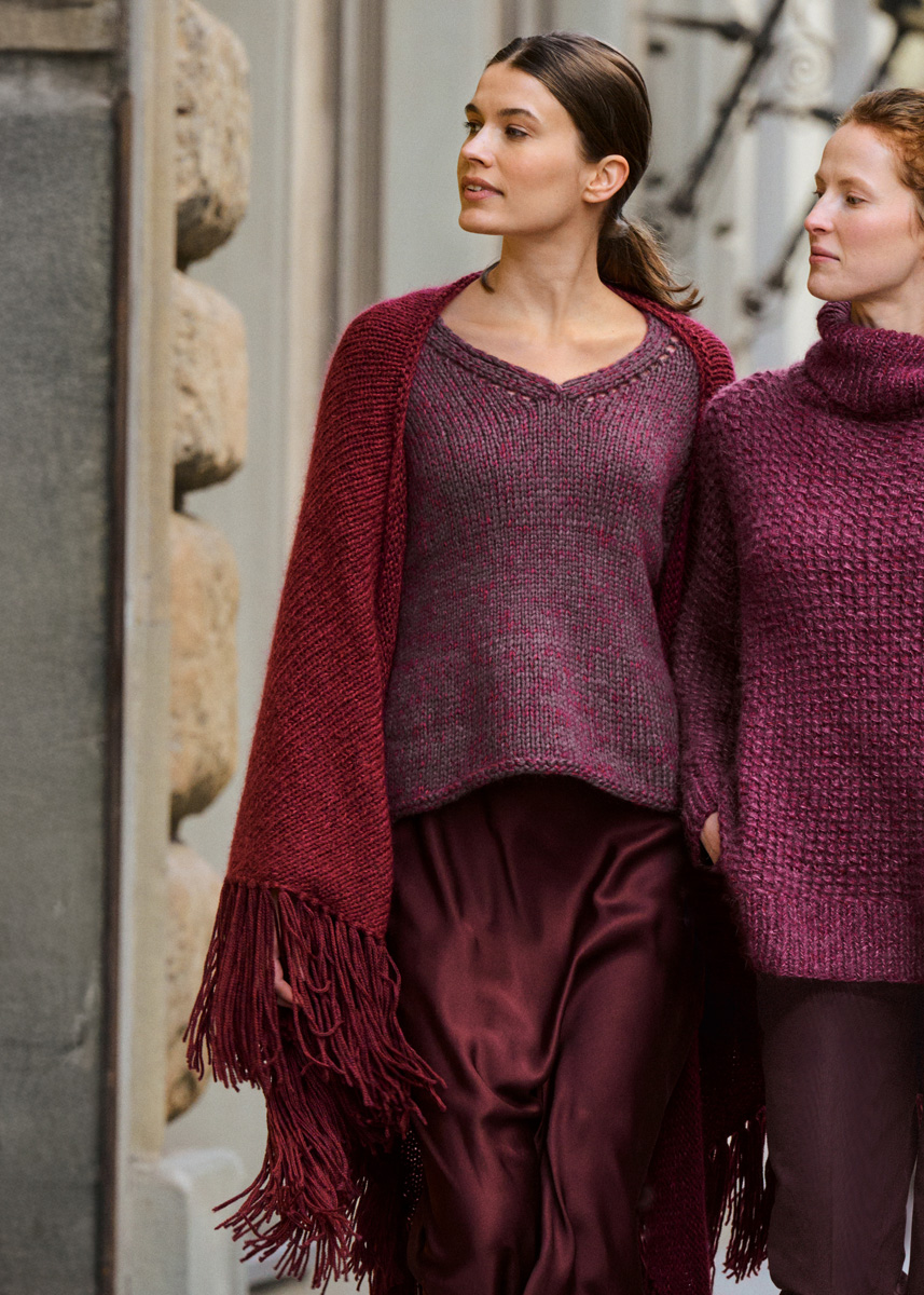 Garn: Lana Grossa «Silkhair» (70 % mohair (superkid), 30 % silke, LL = ca. 210 m/25 g): Ca. 100 g bordeaux (frg 113), Lana Grossa «Alta Moda Alpaca» (90 % alpakka (baby), 5 % ren ull (merino), 5 % polyamid, LL = ca. 140 m/50 g): Ca. 500 g burgunder (frg 94).