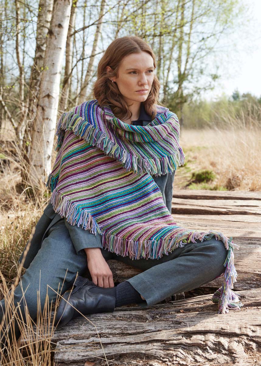 Lana Grossa Farfalla (94% ren ny ull (merino extrafine), 6% polyamid, LL 340 m/100 g), 200 g dus-/grågrønn/syrin/ fiolett/blå/rosé/lys grå/turkis/ gråblå/beige/grå/lys gul (frg 4) og Lana Grossa Cashmere 16 Fine (80% ren ny ull (merino extrafine), 10% kashmir, 10% polyamid, LL 320 m/50 g), 50 g mørk fuksia (frg 59), rosa (frg 60) og hvitgrønn (frg 67) Pinner/heklenål: Rundpinne nr. 4,5, heklenål nr. 4 for å feste frynsene