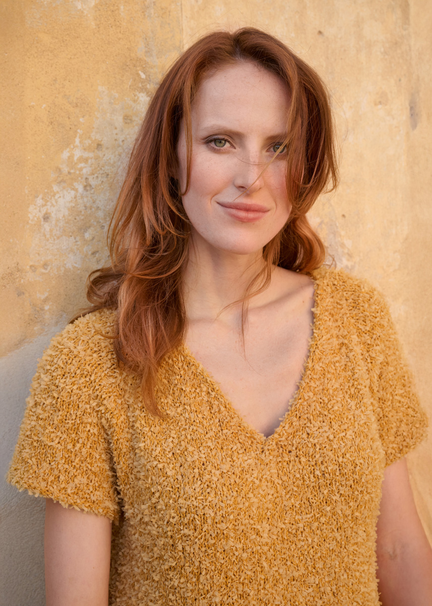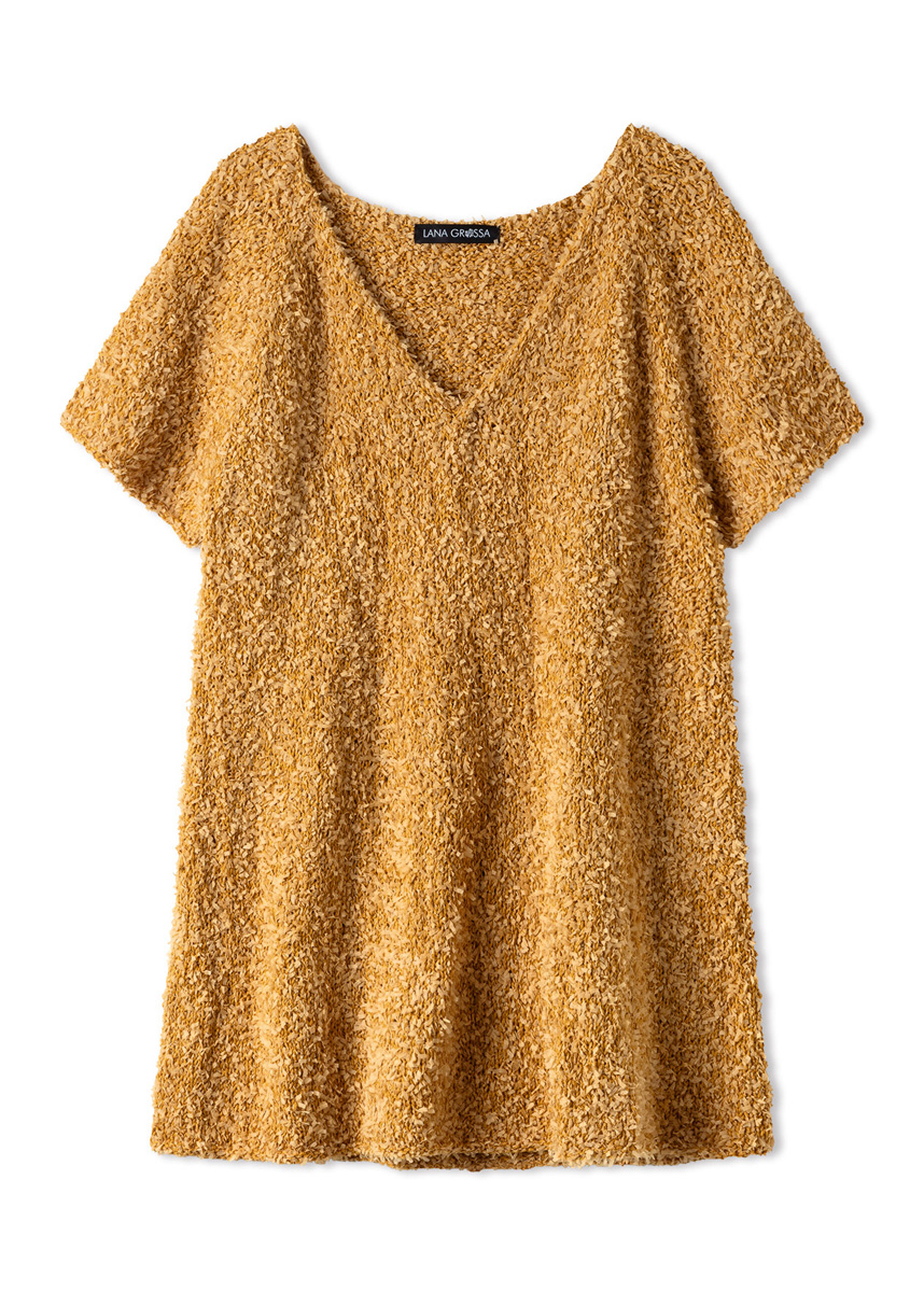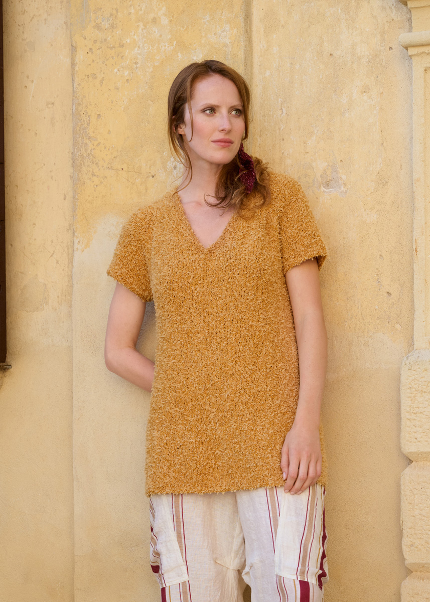 Garn: Lana Grossa «Frizzante» (54 % bomull, 46 % polyamid, LL = ca. 105 m/50 g): Ca. 350 (400 - 450 - 500) g okergul (frg 2). Pinner: Kort og lang rundpinne nr. 5. Heklenål: Nr. 5. Tilbehør: Maskemarkører. Tunikaen blir strikket ovenfra og ned i ett stykke.