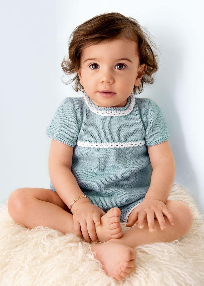 Lana Grossa Elastico (96 % Baumwolle, 4 % Polyester (Elité), Lauflänge 160 m/50 g) je 150 g Zartblau (Fb 130) und 50 g Ecru (Fb 36); Stricknadeln Nr. 3,5, eine 40 cm lange Rundstricknadel Nr. 3,5 oder Spielstricknadeln Nr. 3,5, Häkelnadel Nr. 3; ein Knopf und 2 cm breites Gummiband.