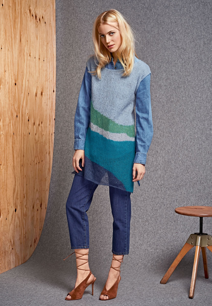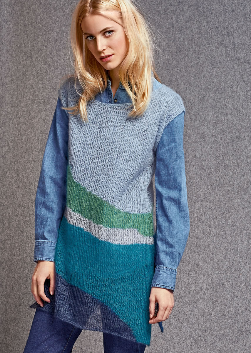 Lana Grossa-Qualität „Silkhair“ (70 % Mohair Superkid, 30 % Seide, LL = ca. 210 m/25 g) 25 (50) 50 g Zartblau (Fb 88), 25 g Grüngrau (Fb 81), 25 g Petrol (Fb 23), 25 g Dunkelgrün (Fb 89) und 25 g dunkles Grünblau (Fb 83). Strick-Nd Nr 6. 4 Hilfs-Nd Nr 6, 1 Häkel-Nd Nr 4,5.